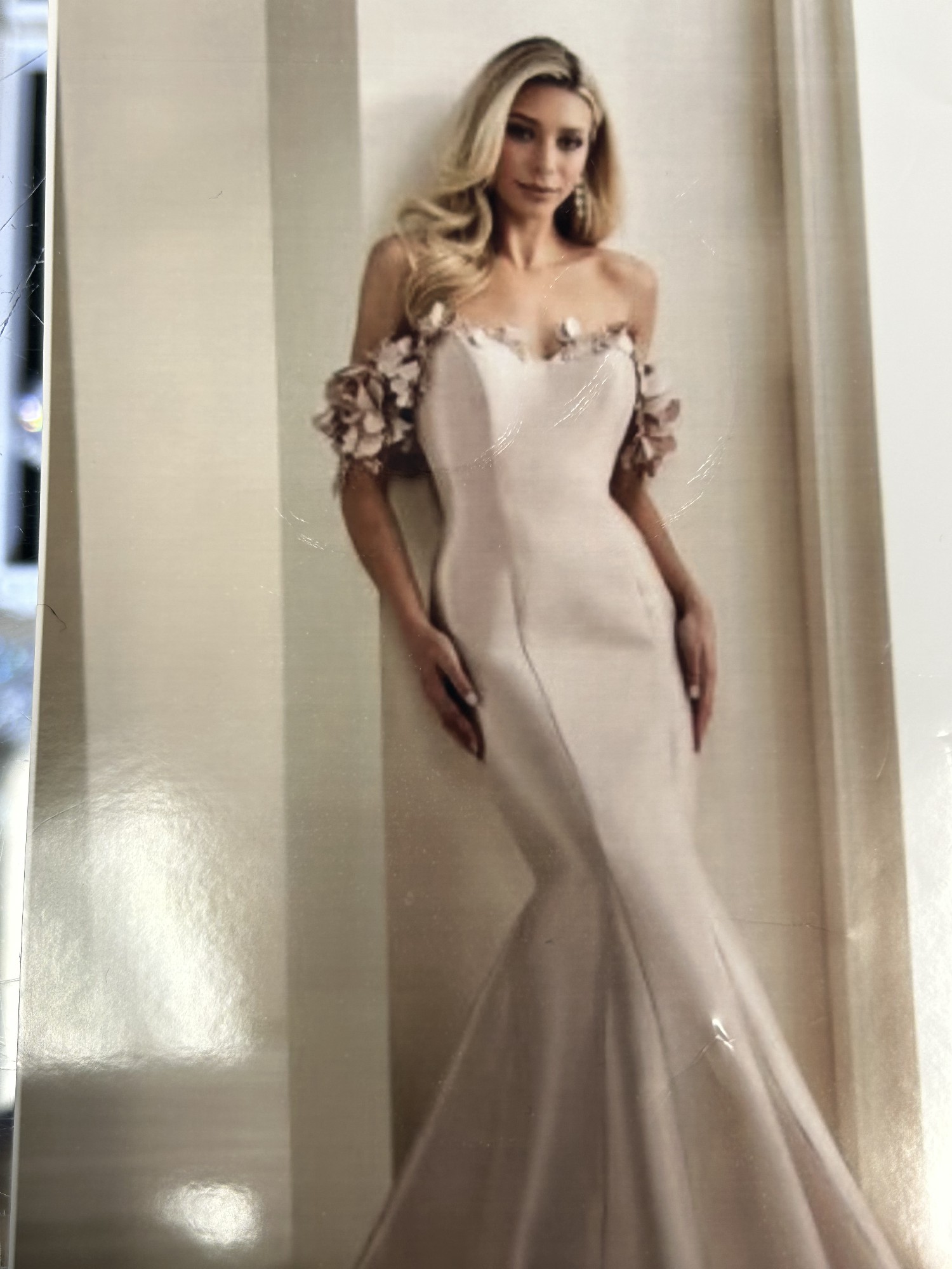 This Mon Cheri M3101 wedding dress embodies romance and elegance, making it the perfect choice for mother of the bride looking to make a memorable statement. Crafted in a stunning trumpet silhouette, the dress flatters every curve while offering the grace and sophistication you desire. The alluring off-the-shoulder neckline beautifully frames your collarbones, while the low back adds an unexpected touch of allure, ensuring you feel confident from every angle.