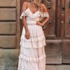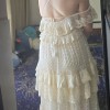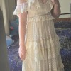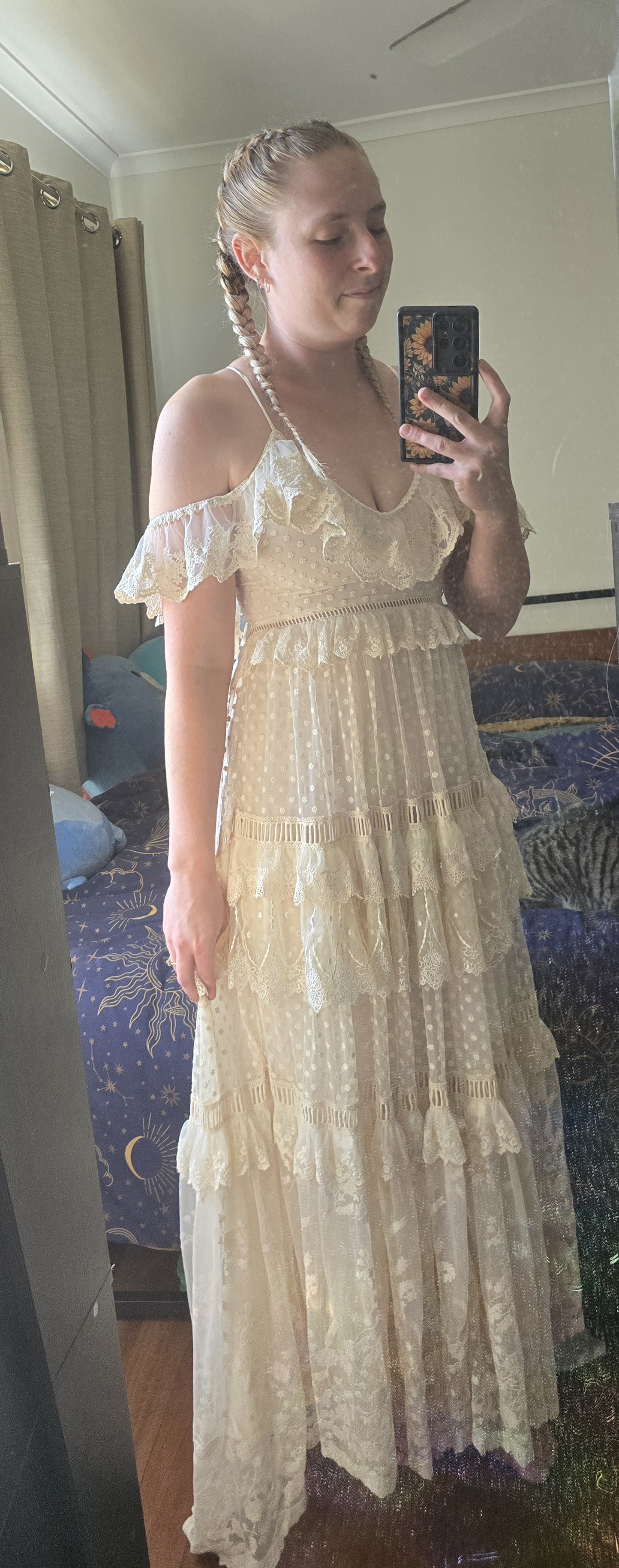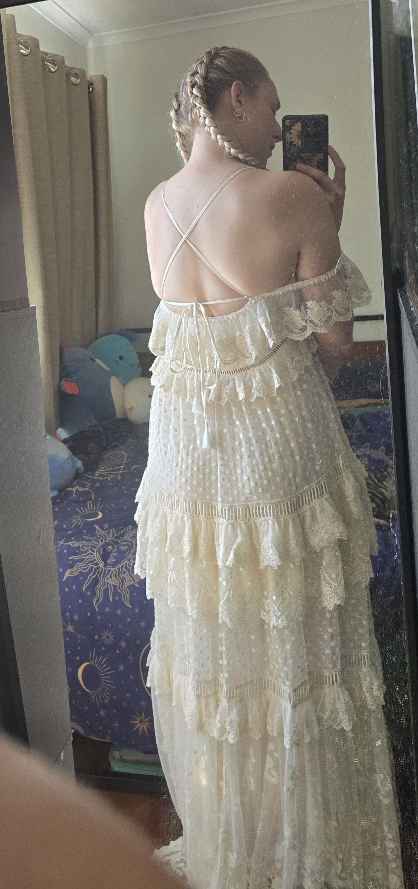 The Spell Chloe Gown is a romantic and timeless lace wedding gown that will make you feel like a true goddess on your special day. The Spell Chloe Lace Gown is sold out everywhere and no longer being produced. Crafted from a beautiful silky off-white, tiered lace with a circular train that flairs behind, this A-line gown features an off-the-shoulder design with soft cross-over straps and threaded tassels for added support. The lace has a detailed floral-like pattern that fits across and under the bust with an open weave band. The hidden zipper enclosure is on the side, beneath the sleeve. The fabric moves and flows with the wearer, creating a dreamy and elegant silhouette. The Spell Chloe Gown is perfect for a wedding ceremony, whether in a garden or on the beach. The low back and off-shoulder design create a feminine and sophisticated look, while the three gathered skirt tiers and train add a touch of whimsy and charm. The hem is scalloped, giving a delicate and romantic finish. Made from 50% cotton and 50% nylon, with a lining of 93% mulberry silk and 7% spandex elastic armlets, the gown features ruffle detail throughout, hidden side zipper closure, adjustable lace-up back, ladder trim detail throughout, and a fully lined bust with a full skirt lining attached at the waist. Colour is off-white, not white. Only worn to try on. Decided on another dress Bought second hand