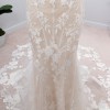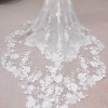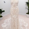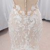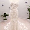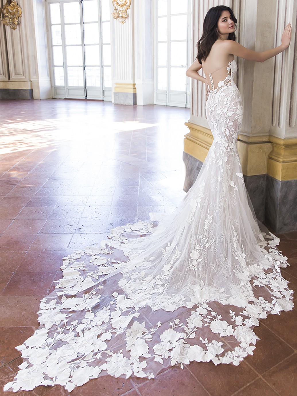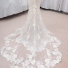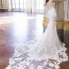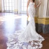 Tracie 22562 by Enzoani: Feel your absolute best with this stunning mermaid gown that will compliment you in so many different ways. From the classic strapless sweetheart neckline bodice to the illusion lace back, this gown will undoubtedly flatter you. The embroidered floral lace under the layer of Chantilly lace and glitter tulle with unique linear piping details all come together to create this magnetic bridal beauty. The minimal bow belt detail and lingerie-styled tailoring create this ever-so romantic look, as it cascades down into a double scalloped lace train.