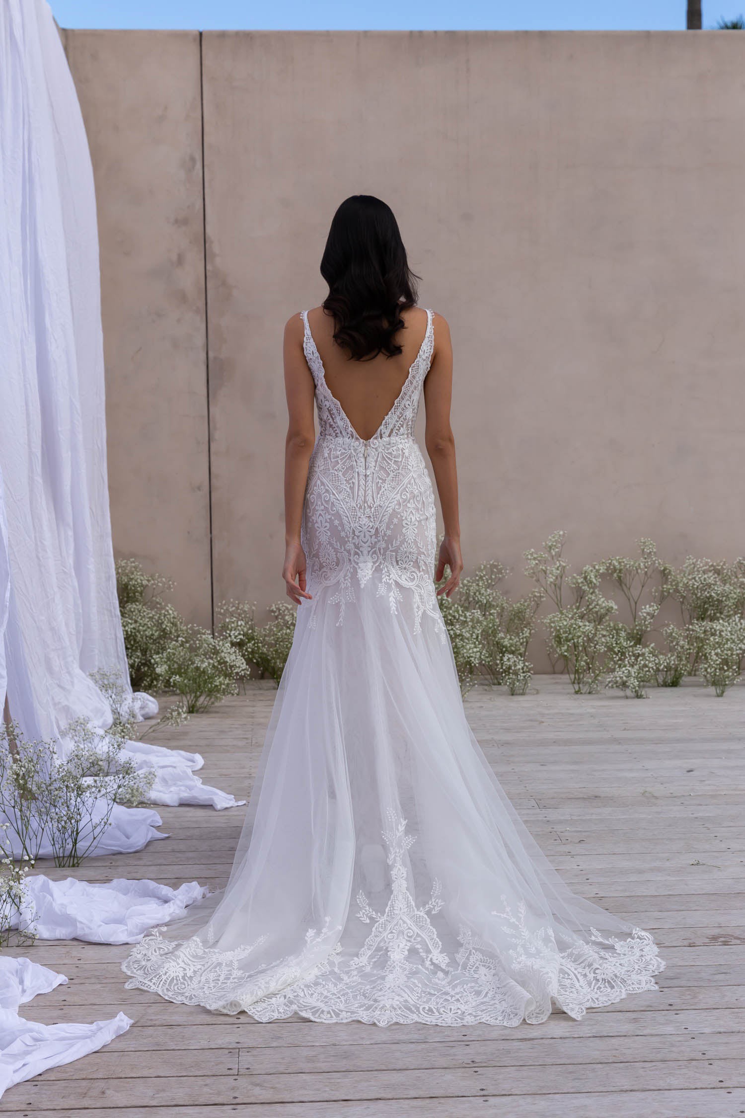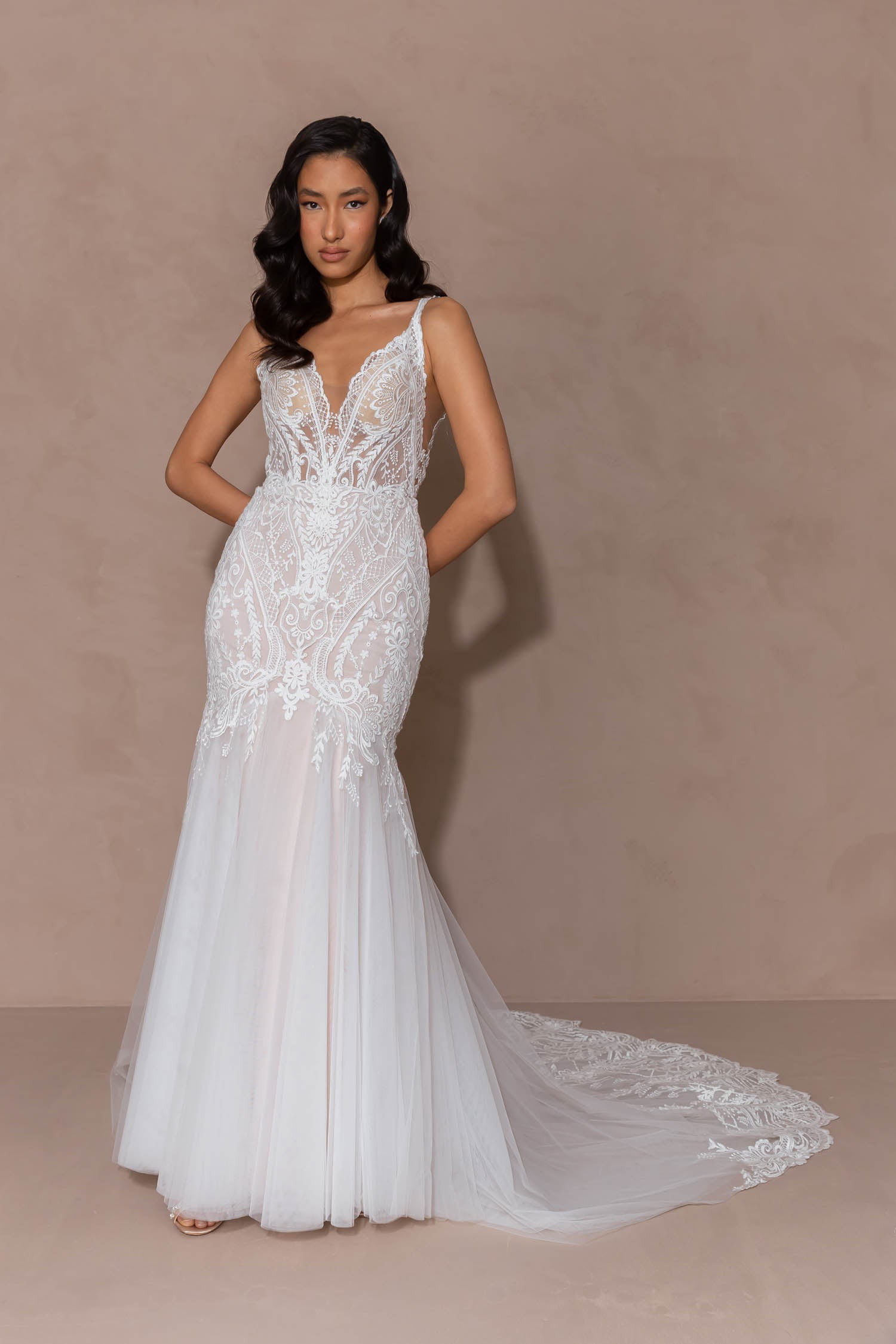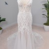Noah EY403 by Evie Young Bridal: Elegant, captivating and elevated. Made for the modern bride seeking sophistication and effortless allure. Noah is the gown that offers a new detail at every glance. Drawing your eye into the soft mandala-inspired embroidered lace that adorns her illusion bodice and upper skirt. Her neckline falls into a soft V neckline with delicate scalloped lace edging, mirrored on the back in a deeper backless V cut-out. Noah is formed in a feminine fit and flare silhouette, with layers of cascading tulle to create a full skirt and 30″ illusion train. Her plunge illusion bodice is constructed of 6-piece signature boning and cups for a supportive and comfortable fit to ensure you feel confident on your wedding day. Noah flatters all body shapes especially our gorgeous curve brides.