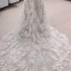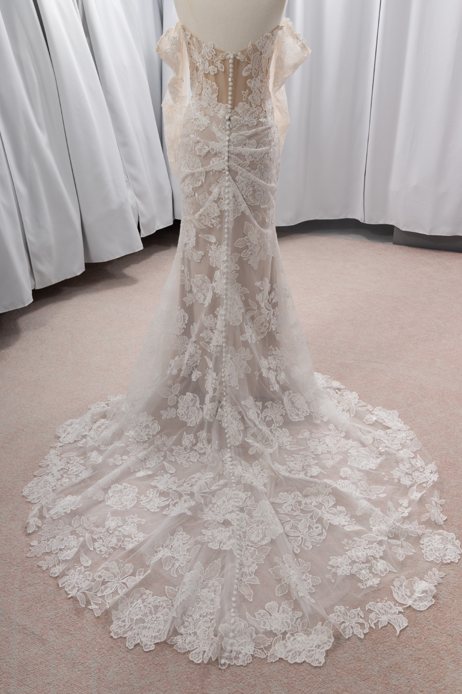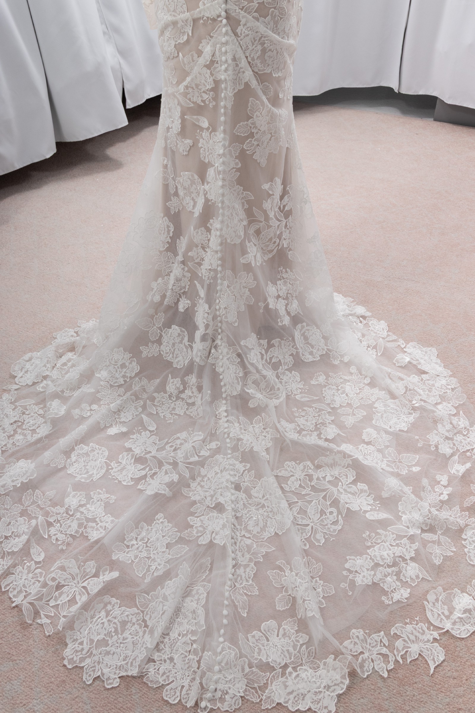 Asymmetrical pleating contours from behind and gently flows out into the train with centre-back buttons to her hemline.