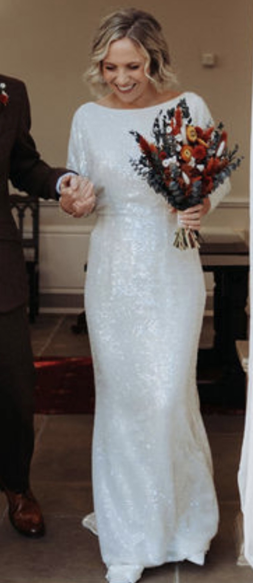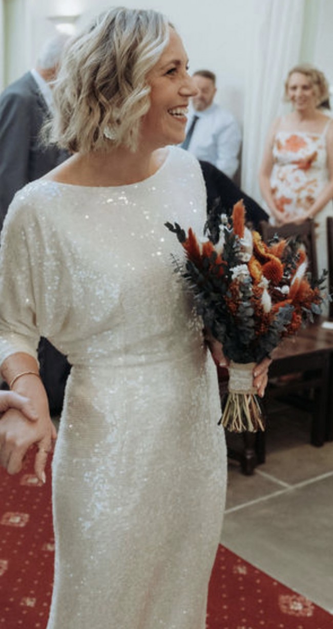 Adorned with sparkling sequins, this dress shines under both natural and artificial light, creating a captivating effect. I especially loved the 3/4 sleeves, which provided just the right amount of coverage while allowing for ease of movement. As I walked down the aisle, I felt like a true goddess, and I want someone else to experience that joy.