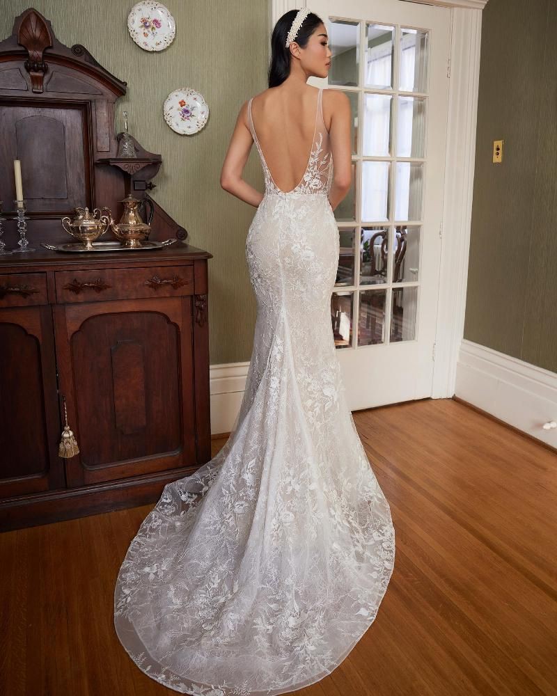On the surface, Shae may seem like a simple wedding gown, but don't be fooled by her understated elegance. Upon closer inspection, you’ll find she’s full of details worthy of your second yes. Designed with delicate floral lace adorning her tank straps, sexy v neckline, and backless sheath silhouette. Complete the look with a veil, and you'll be a vision of timeless bridal beauty on your special day. Color: Ivory / Light Nude.