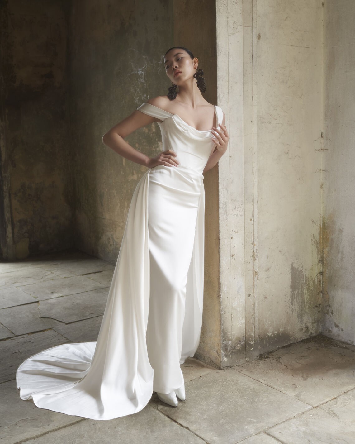 Has detachable right off-shoulder sleeve.