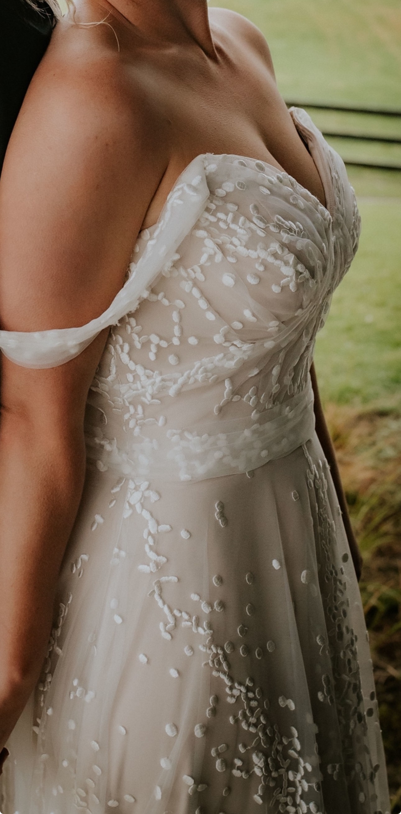 Absolutely Stunning and beautifully designed wedding dress. Worn March 2024. I got so many compliments in this dress and how it was one of a kind! Very sad to let it go but having sons I know it won’t be worn again!