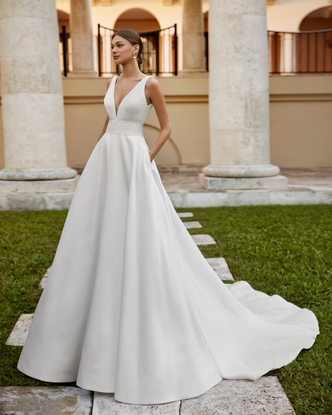 Eterno is a beautiful designer wedding gown by Rosa Clara. The fabric is a luxurious Sienna, in the softest ivory. Sienna is very similar to a Mikado fabric.