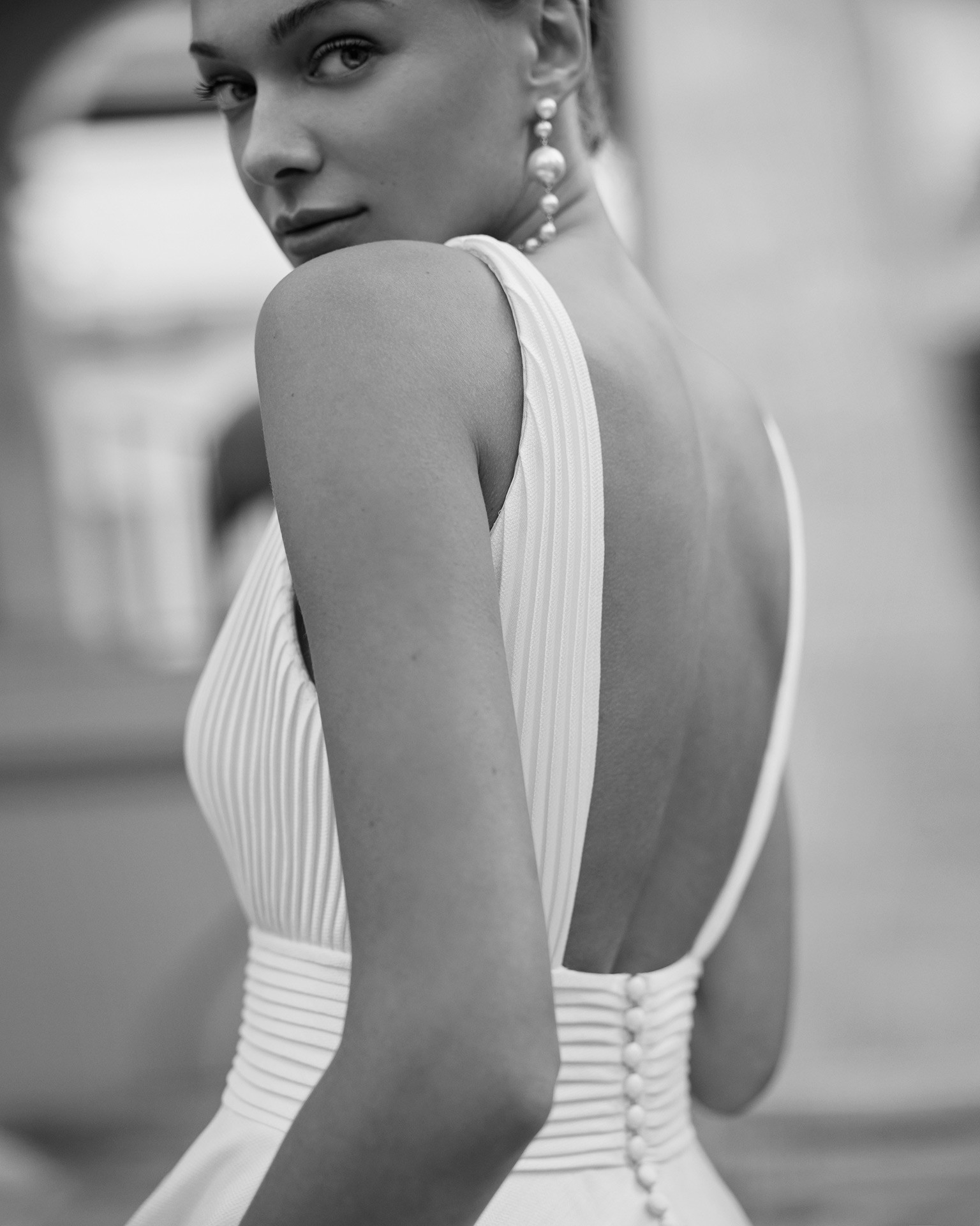 It has an exquisite pleated bodice, a deep plunge V neck to the front and a deep square back with matching, covered buttons and loops that cover the concealed zip. Feature pockets in the full A line skirt.