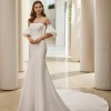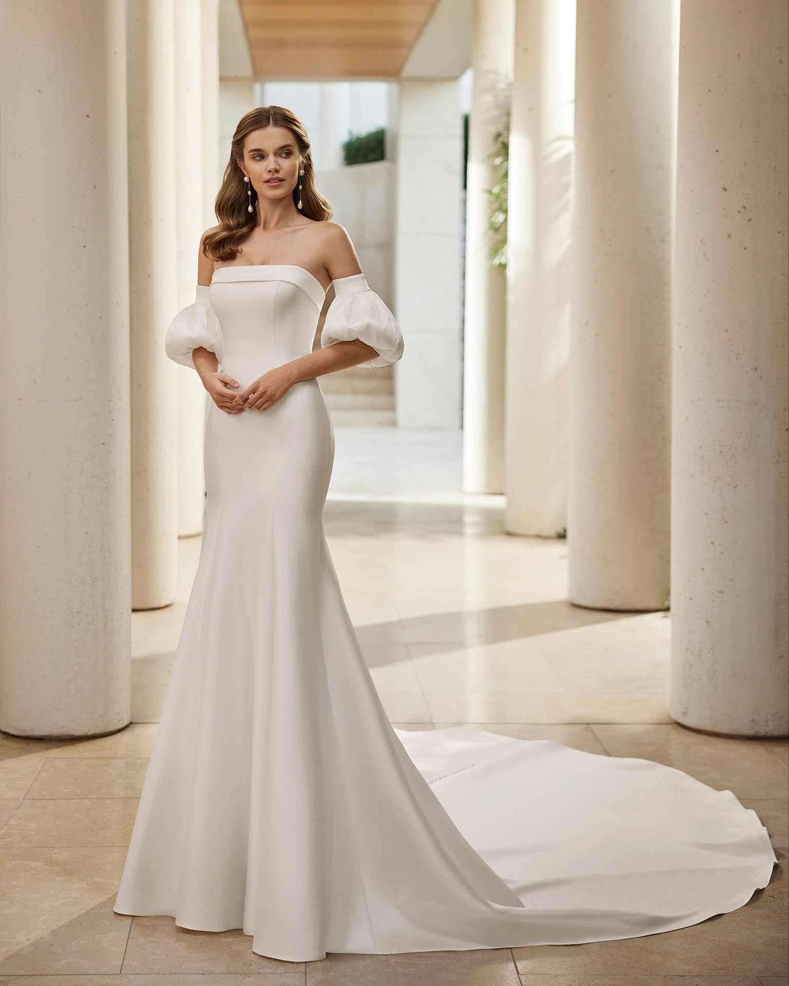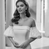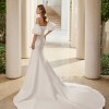 This dress in an exquisite ivory strectch/Mikado fabric, which lends a luxurious feel that truly elevates your special day. It features the detachable puff sleeves. They allow for two distinct styles—romantic and ethereal for the ceremony, and sleek and modern for the reception. This versatility allows you to put your own style on this beautiful gown, changing gracefully from one part of the celebration to the next.