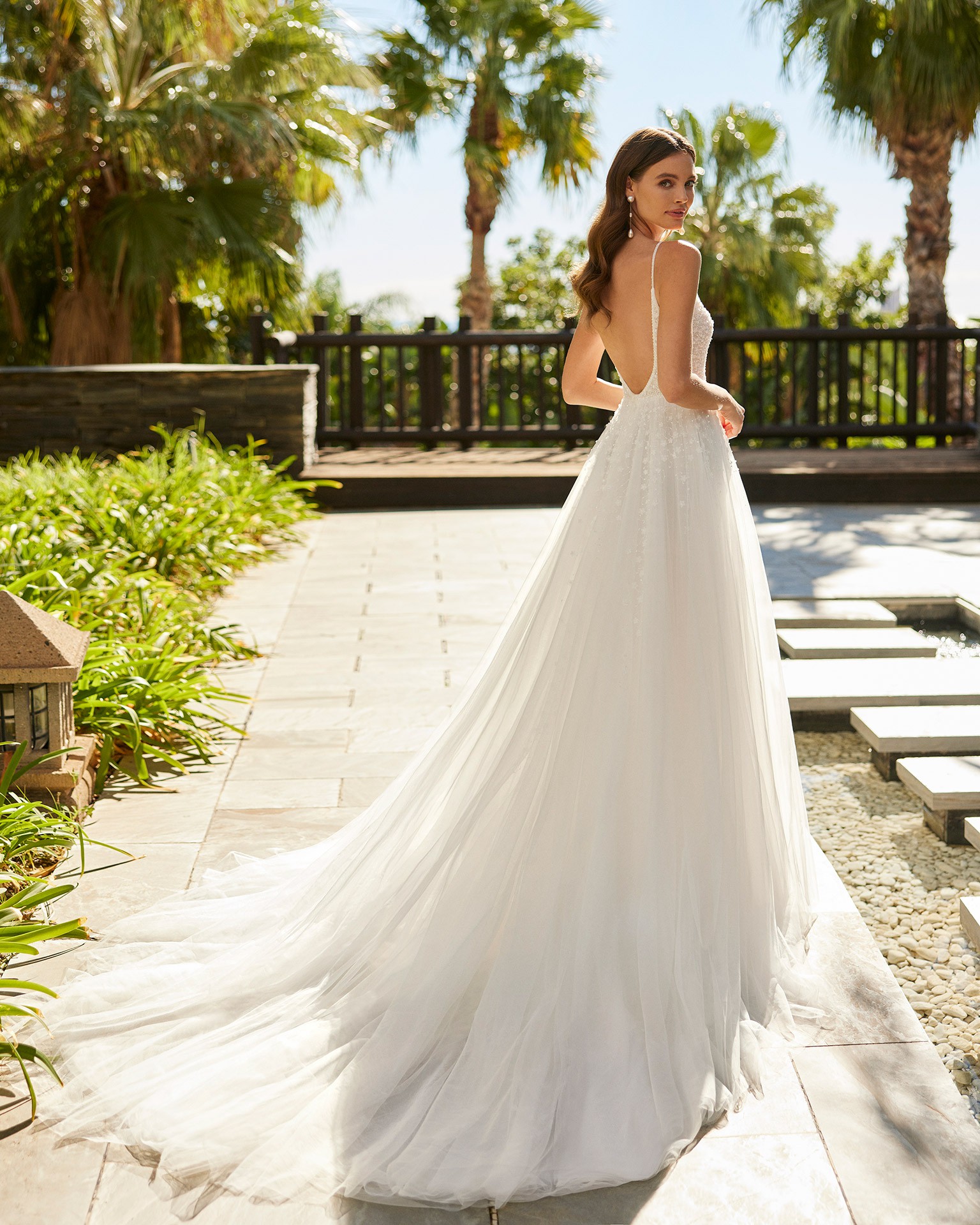 The gown is made in the most delicate soft tulle (net) and the V-neckline, with the most delicate straps and backless design added a touch of elegance and surprise, allowing the tiny, stunning 3D flowers, intricate beading, and shimmering crystals to shine. The pearls embroidered throughout the fabric catch the light beautifully, creating a soft, romantic glow.