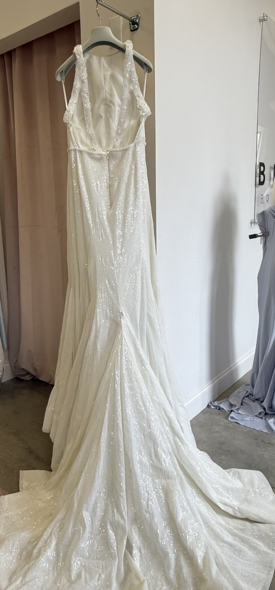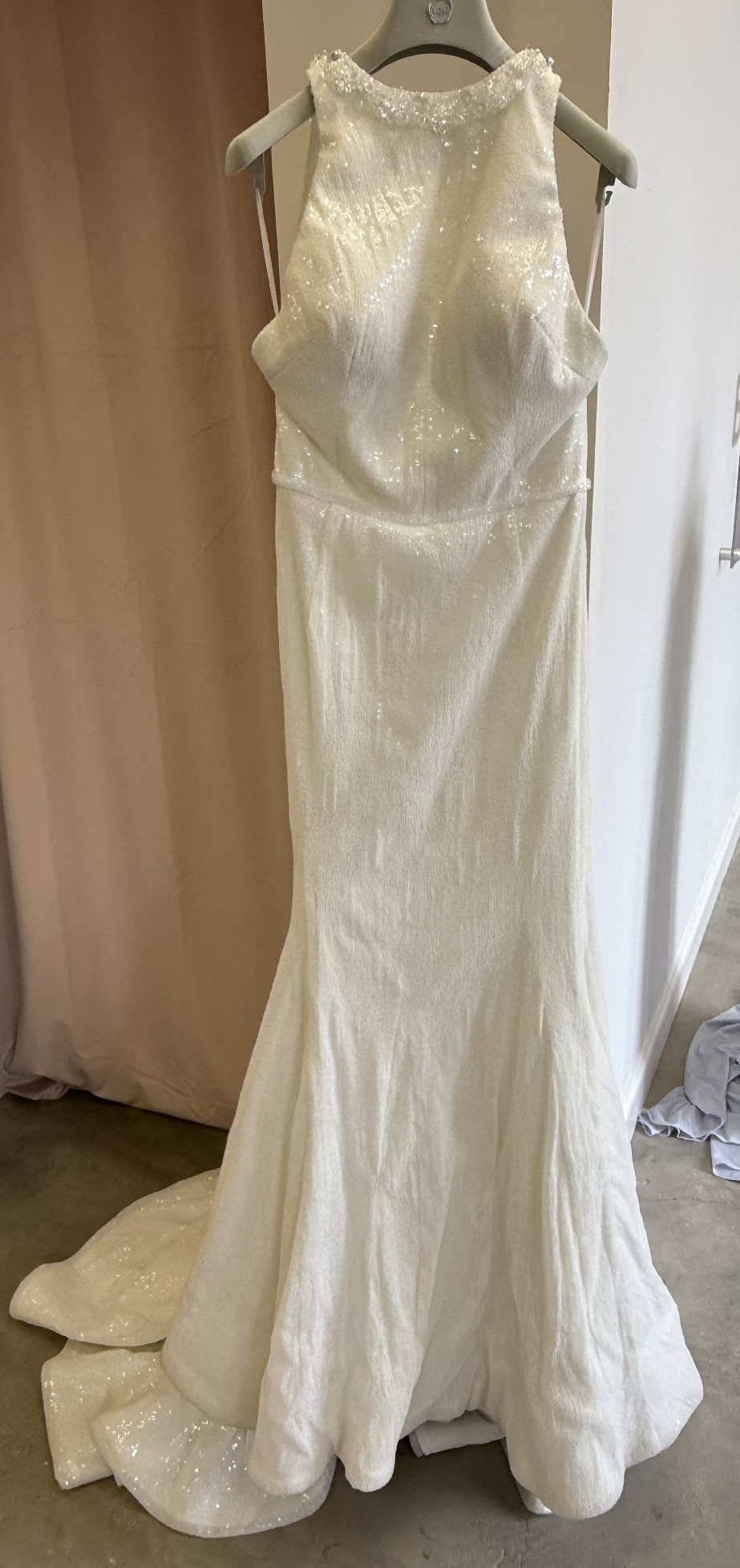 Adorned with delicate beading, sparkling crystals, and shimmering sequins, this dress captures light from every angle, making you feel radiant throughout your ceremony and reception. The graceful floor-length hem creates a timeless look that will leave your guests in awe as you float down the aisle.