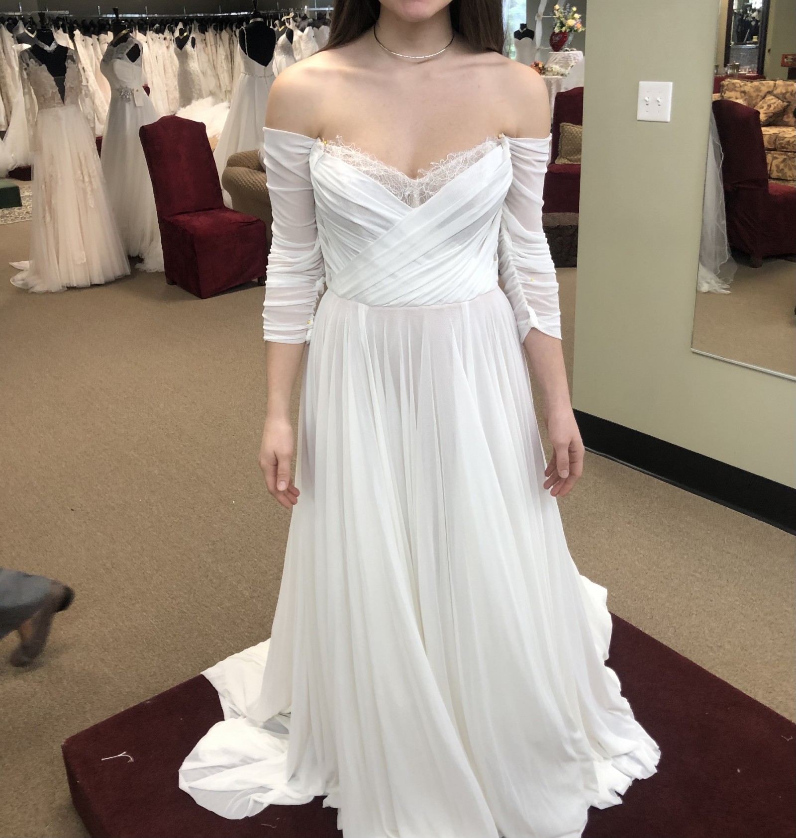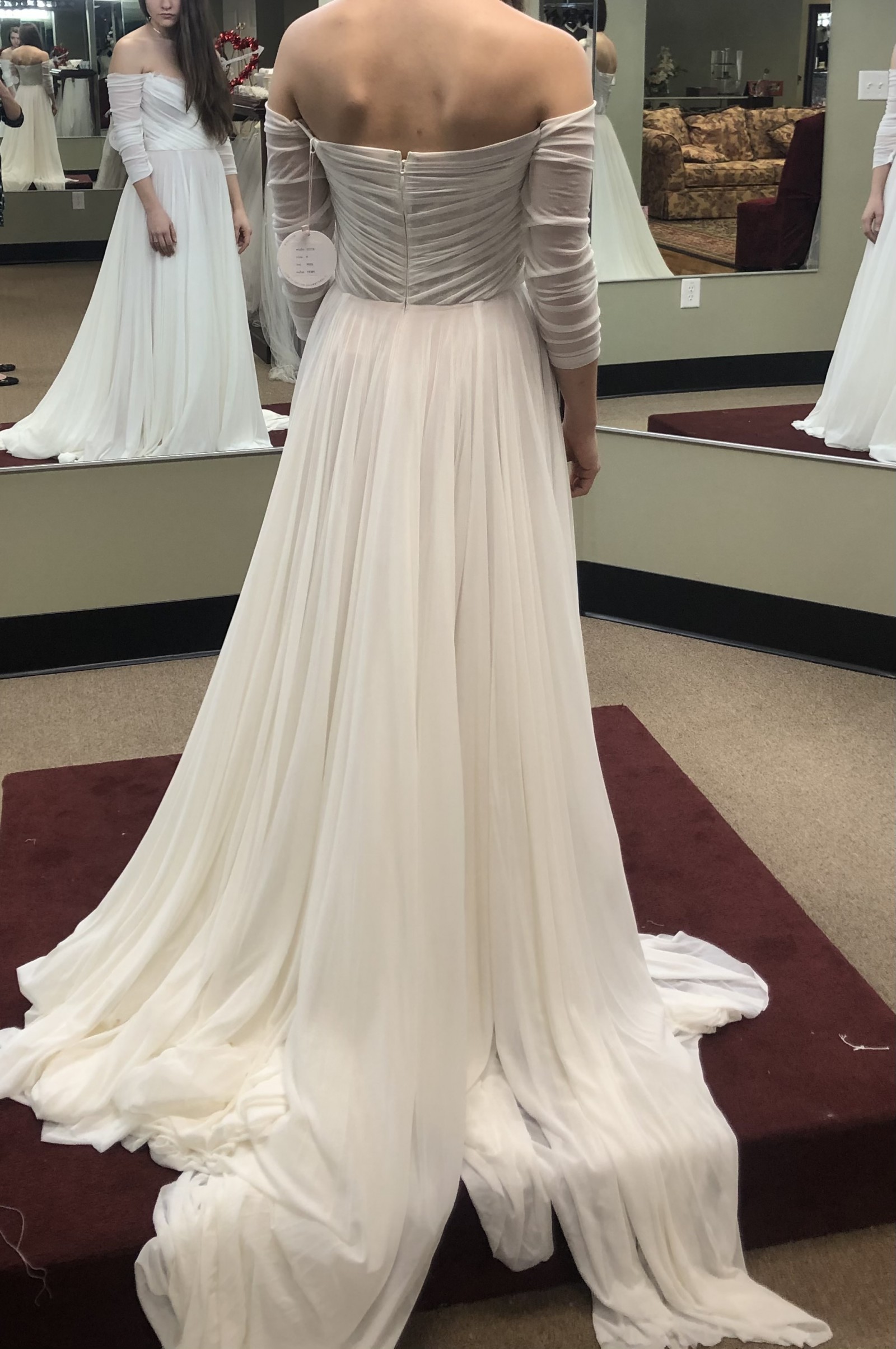 Originally paid $1700 for the gown but ended up going with another style. The gown is a size 4 but can be sized in to a 0 or up to a 6 without the dress losing integrity.