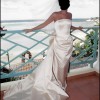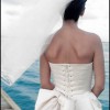 Oyster pink strapless wedding dress. Straight Duchesse satin dress with a large back bow and attached train. It has a boned and corsetted bodice and a flat-fronted tapered skirt, and the back bow creates a bustle effect.