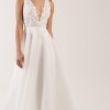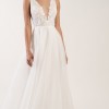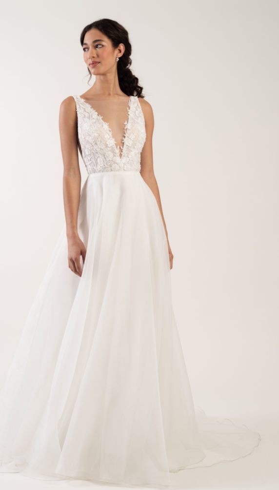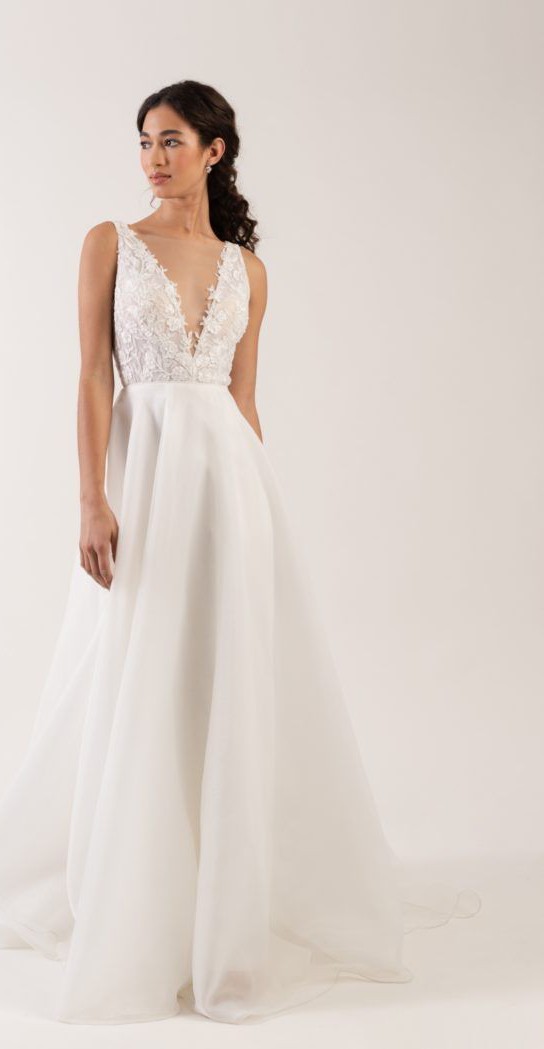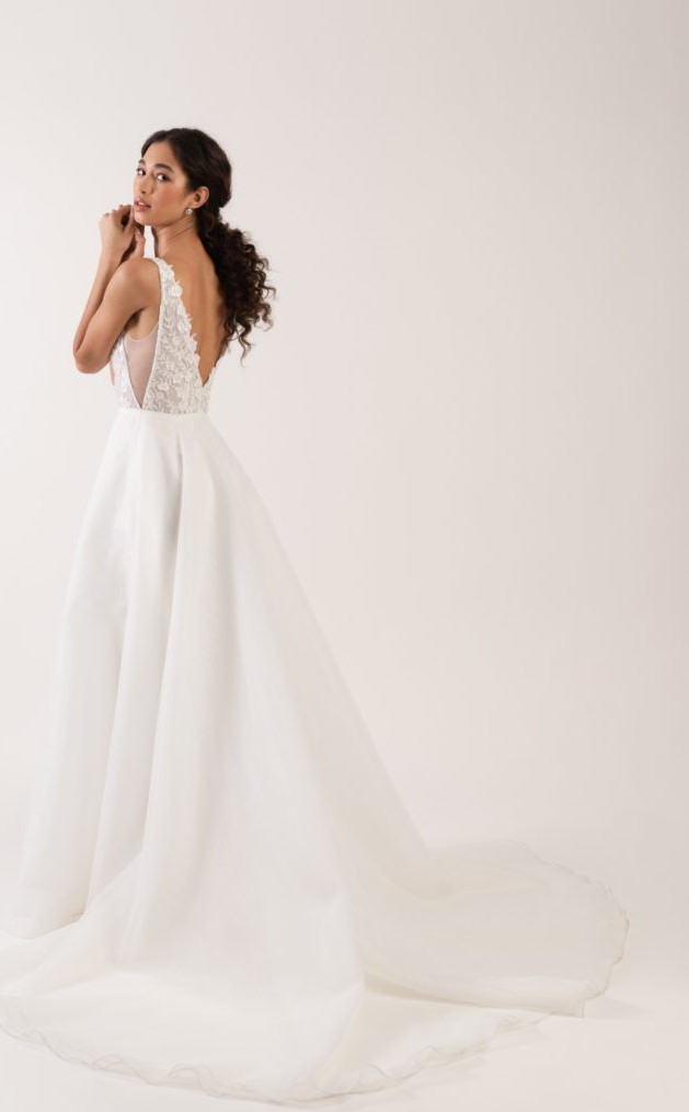 Rosamund is a romantic A-line wedding dress in airy organza with a beaded lace bodice and plunging illusion V neck neckline. Light weight and very comfortable, with a lace bodice and a full organza skirt. It would be perfect for an outdoor wedding and could easily complement any wedding style.
