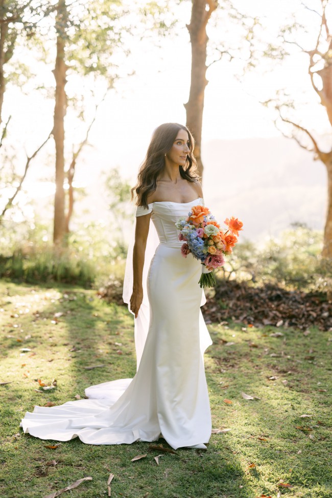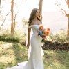 Can be worn strapless or with detachable off the shoulder draped sleeves. Adorned with a row of fabric cover buttons down the back zip.