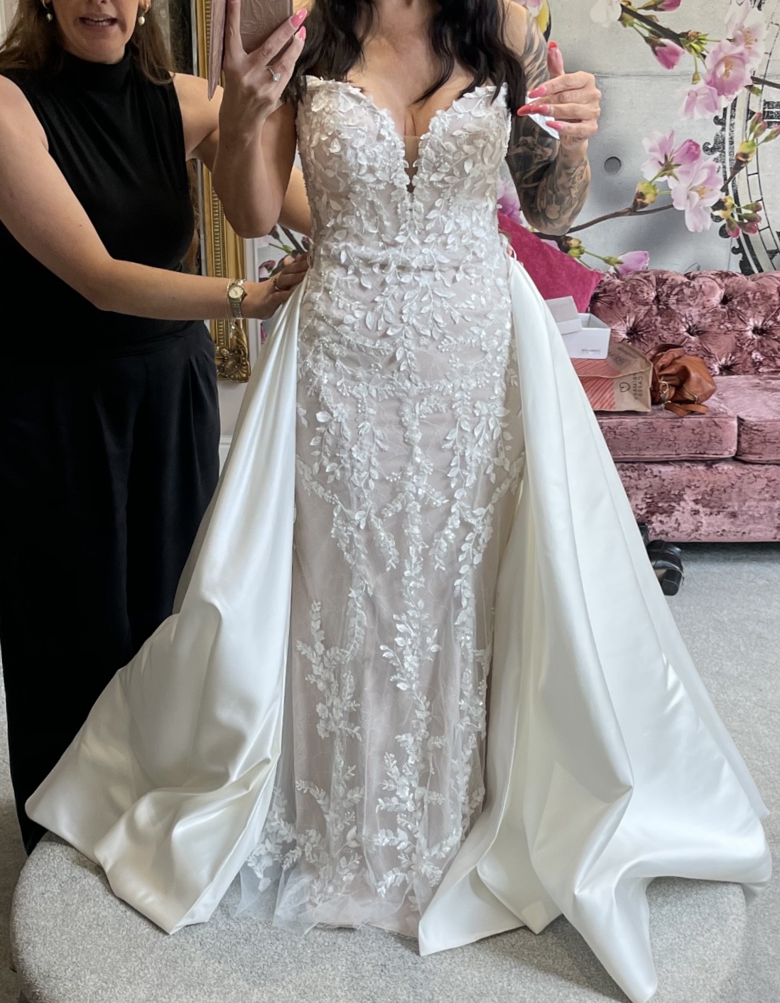 Beautiful nude/blush/sand lining underneath that makes the detail pop, removable sleeves, beautiful train, concealed zip up button back, dress comes with unattatched lace trim (picked up like this in boutique) incase of needing to alter the length then seamstress can easily reattatch.
