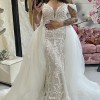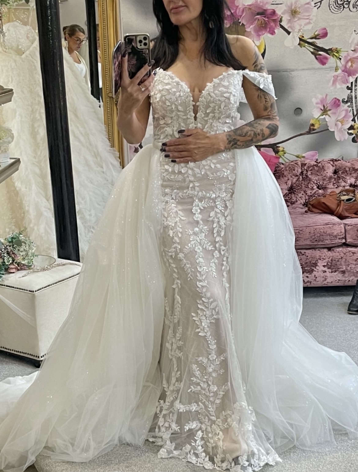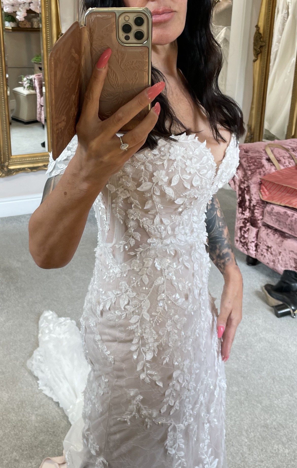 Website description ; Elegant and romantic, Style D3992 is a sexy fit-and-flare wedding gown with brilliant and unique embellishments. From a strapless plunging sweetheart neckline, detachable lace and tulle off-the-shoulder straps grace the upper arm, adding a soft and alluring detail to the fitted bodice. Impeccably tailored through the torso, the gorgeous lace gown wraps around the figure into a sheer corset back with 3D floral accents and a subtle row of fabric-covered buttons down the spine. Delicately painted in scattered leafy lace appliqués and 3D floral accents, the fit-and-flare silhouette hugs the hips and flares into a soft, sweeping skirt and shaped train edged in the same brilliant
