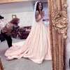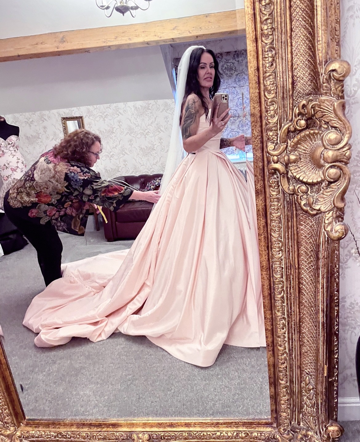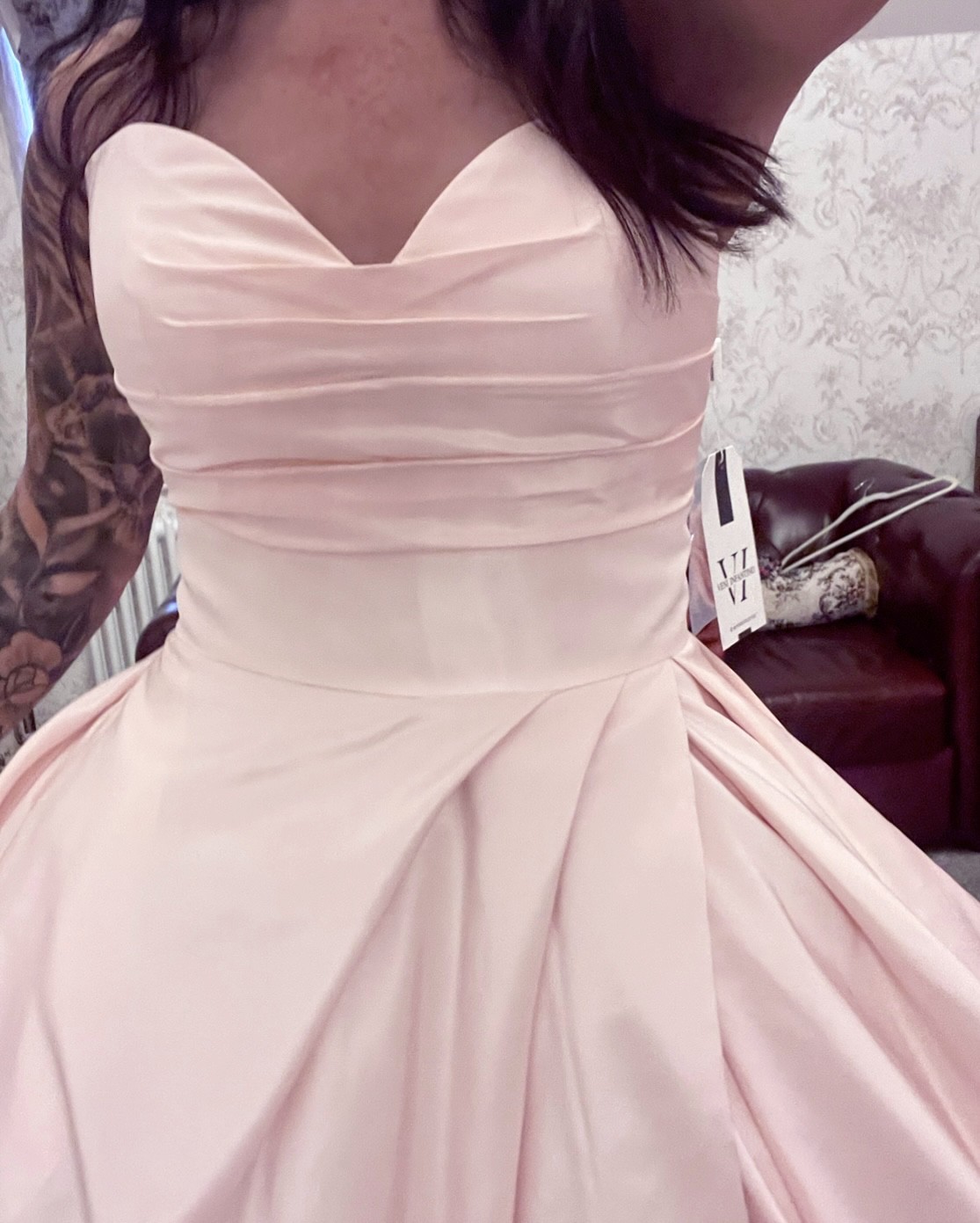 This is a true princess dress, buttons all the way down the huge train, beautiful subtle but classy pink color, nipped in waist, then poofs out, i was complimented allday, & people thought it was a Vera Wang dress! 🩷