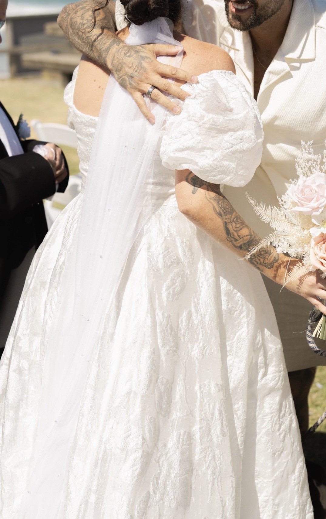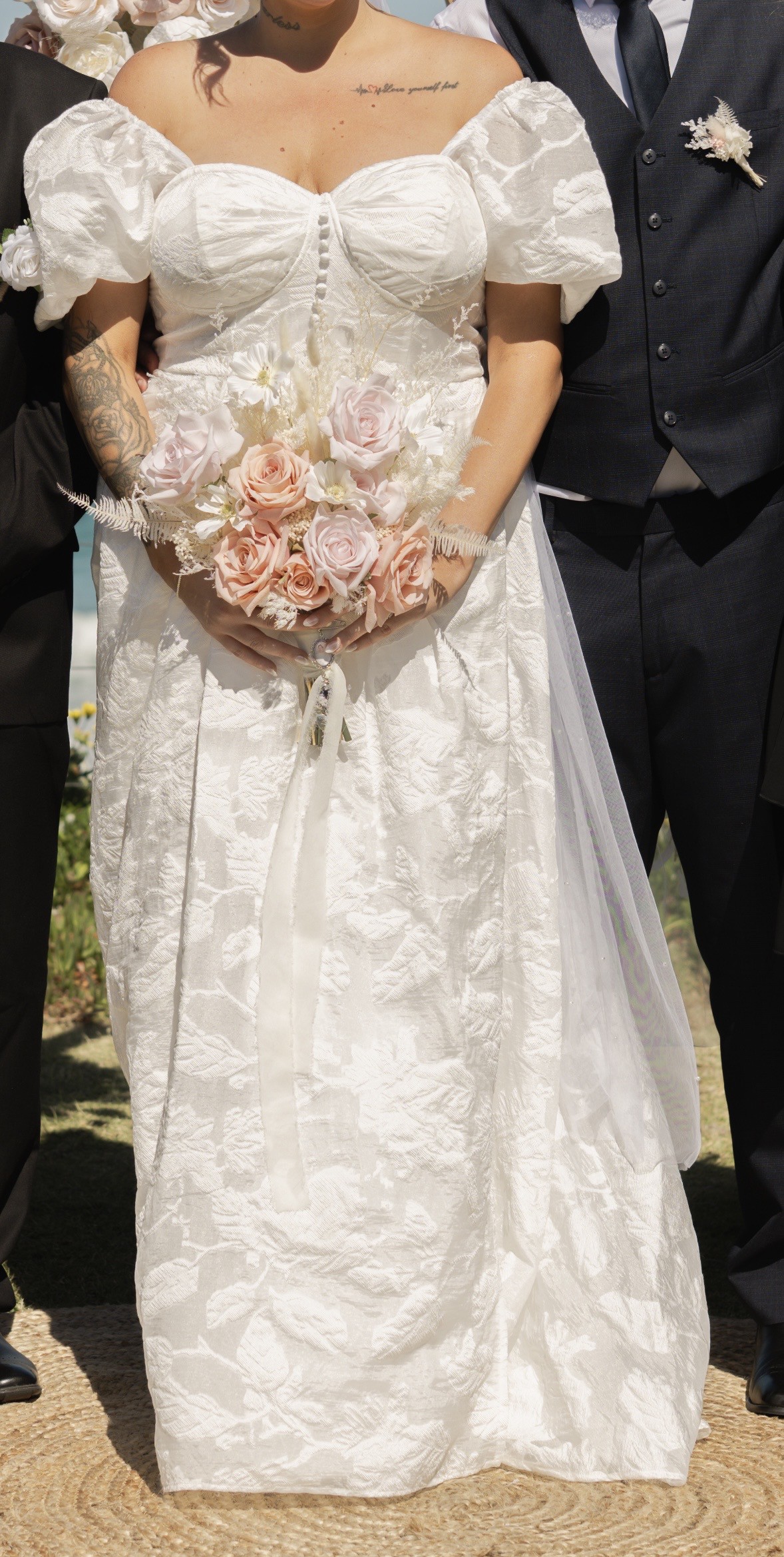 Beautiful off the shoulder wedding gown in soft ivory, featuring puff sleeves, a supportive structured bodice, covered buttons, and a flowing A-line skirt with textured floral detailing that photographs beautifully. The skirt also has a stylish split on the left side for added movement and elegance.