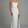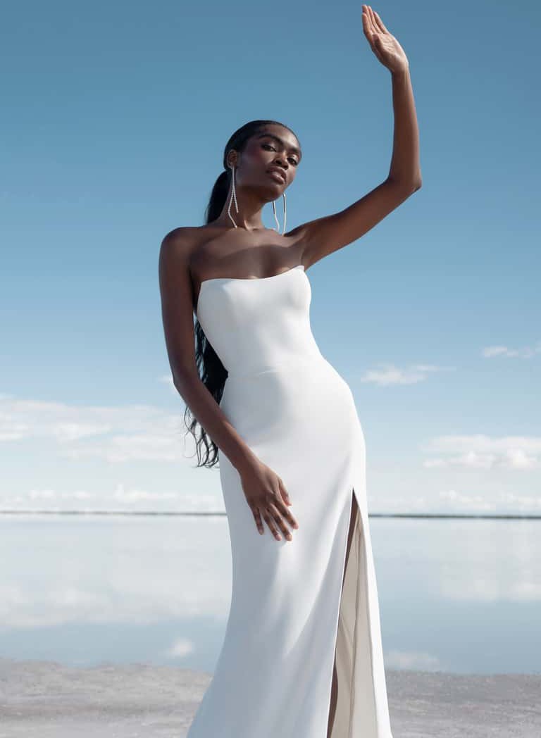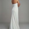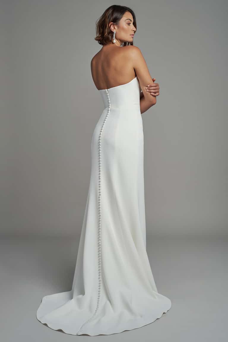 The Bryant strapless wedding gown takes a modern approach to a timeless bridal silhouette. A beautifully sculpted scoop neck and fully boned bodice effortlessly flatters the décolletage and collarbone, while a daring slit cuts across the slim fit and flare skirt. Covered buttons down to the hem add a classic bridal element.