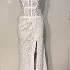 Style: Strapless, corset bodice, fitted skirt with front split