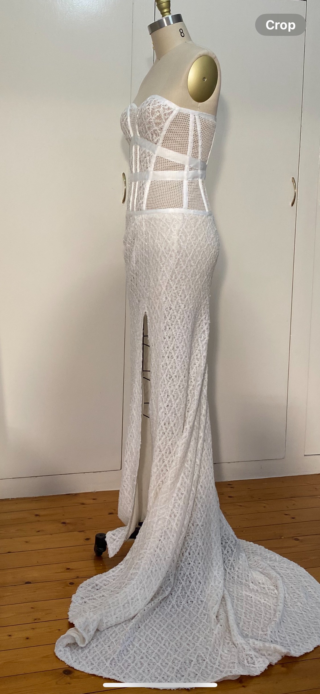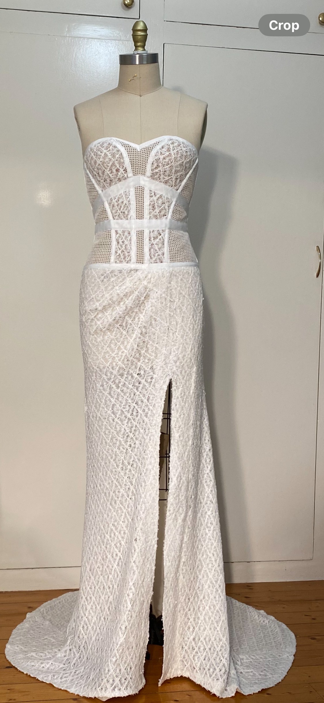 This stunning, modern wedding gown features a structured strapless corset bodice with sheer boning and lace detailing, paired with a sleek, fitted skirt and elegant front split. The silhouette is timeless yet contemporary, beautifully contouring the body while remaining light and comfortable to wear.