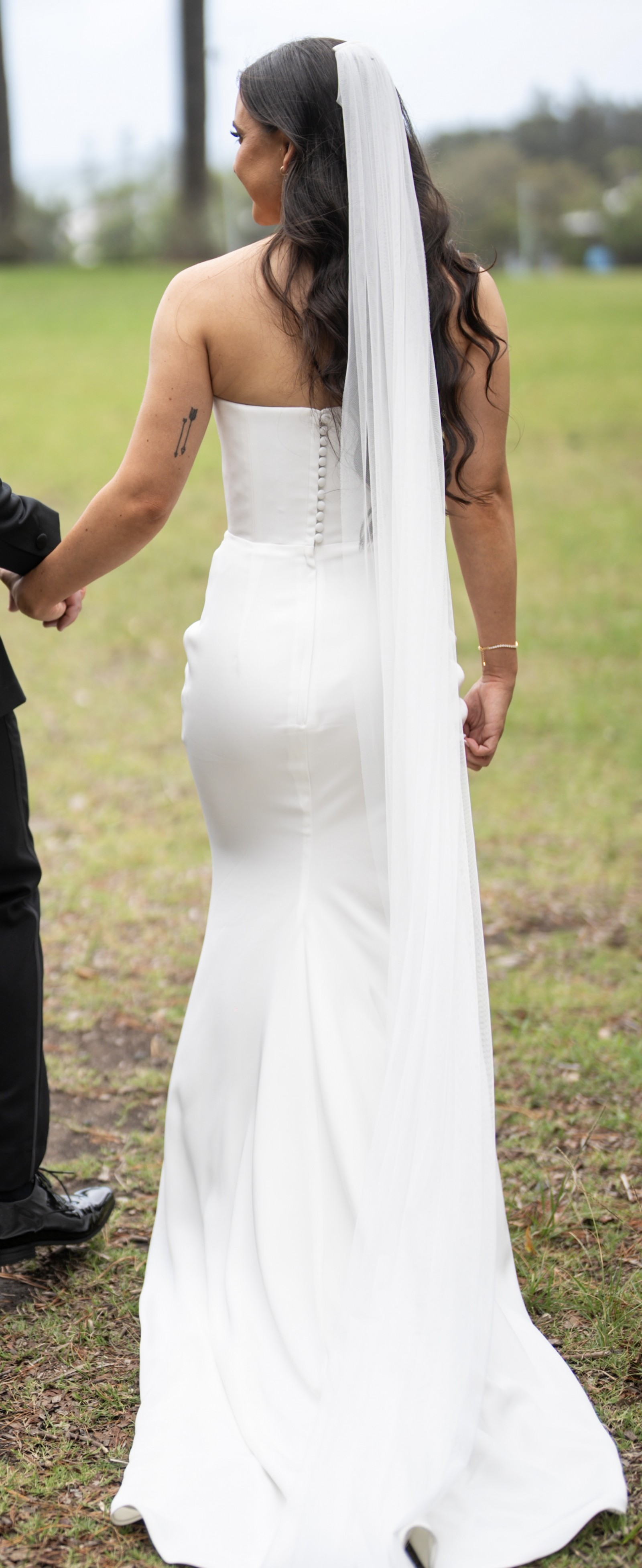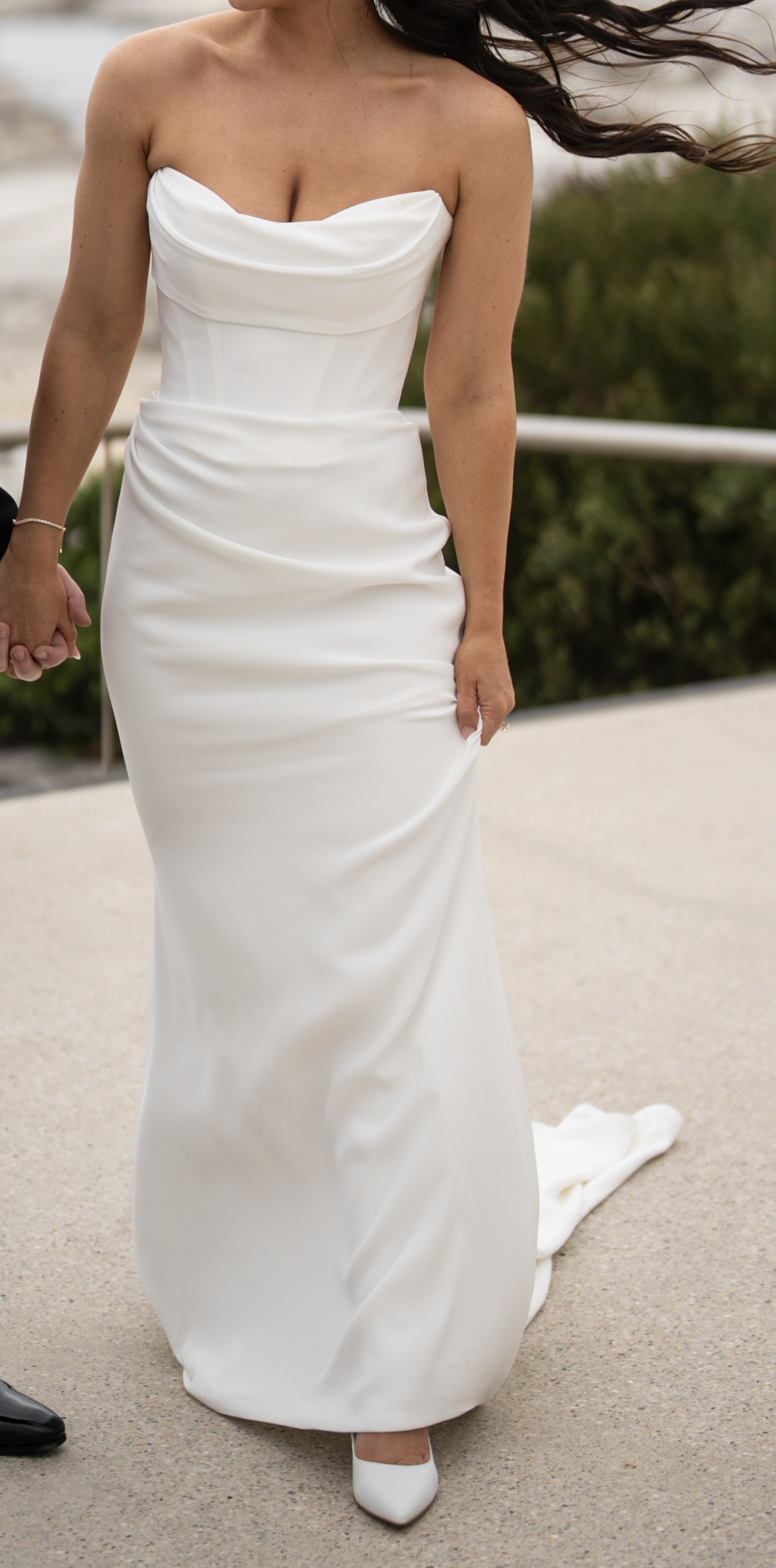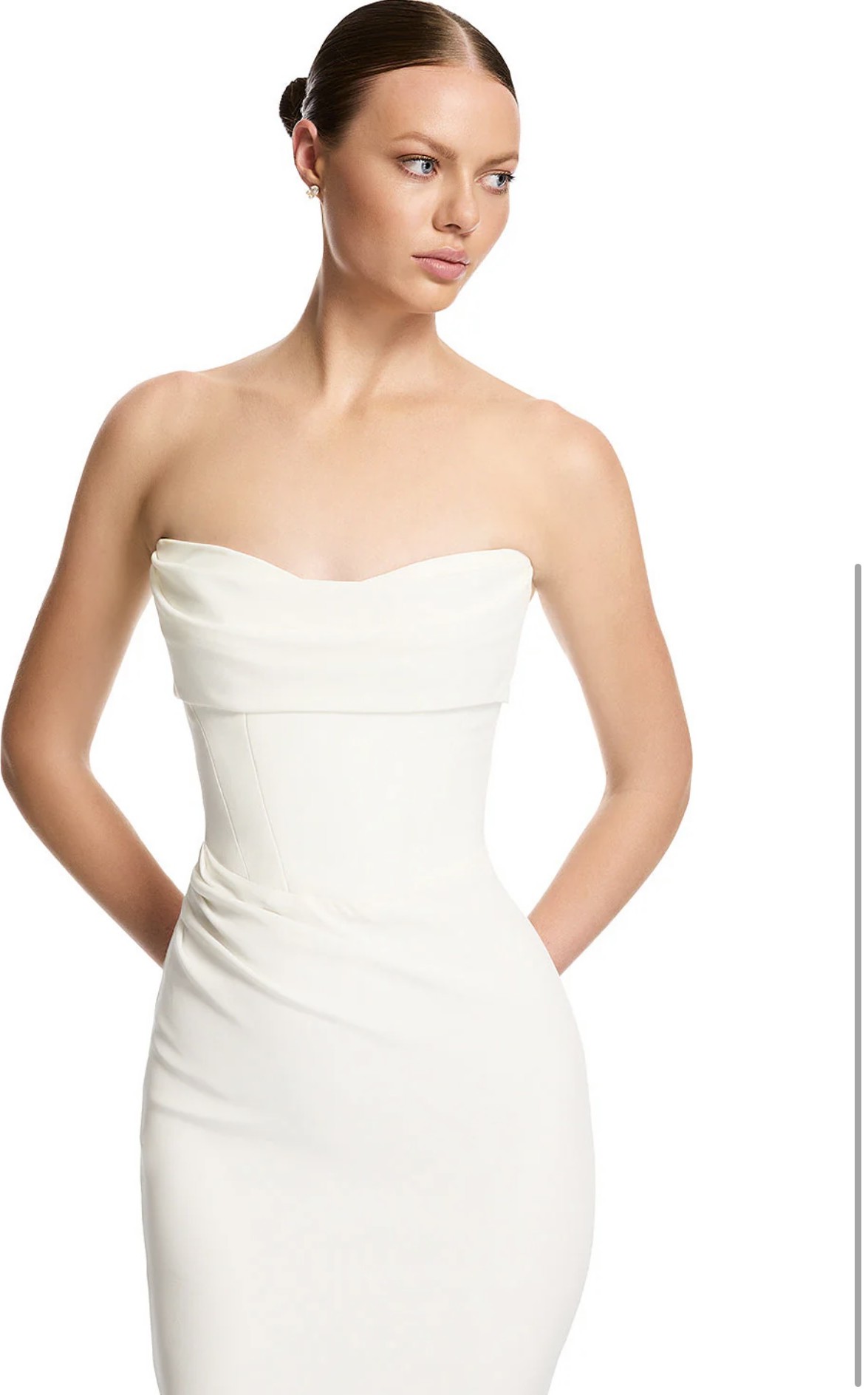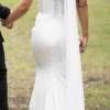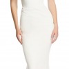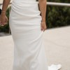 Structured bodice with drape detail across v-neckline, fit and flare skirt with draping at waist. Center back zip and buttons on bodice.