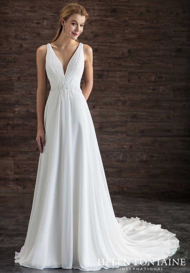Plunge neckline front. Has delecate pleating over bust to waisline Bodice.