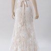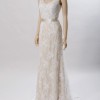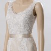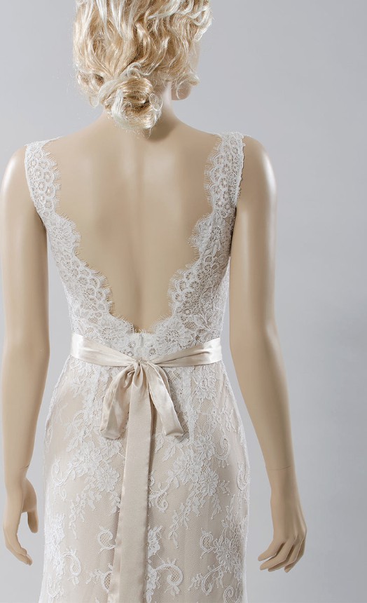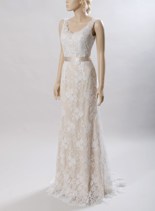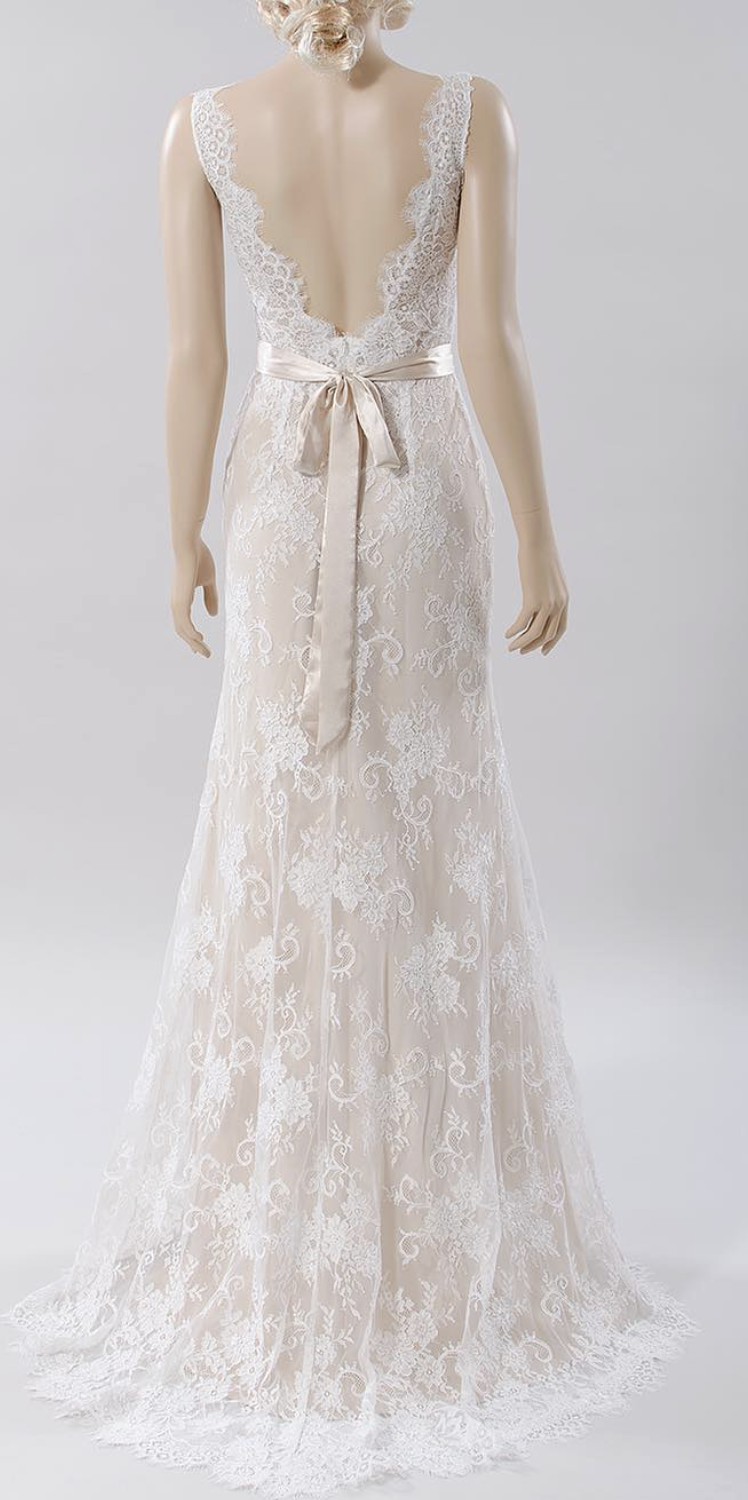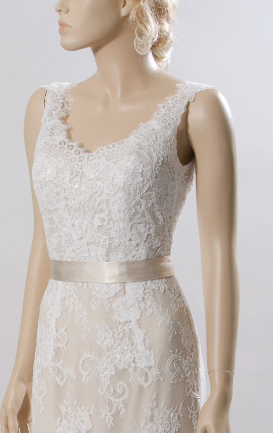 Gently fitted lace wedding gown in perfect condition. Sewn by hand by Tulip Bridal, a family business in the Seattle are. Two types of lace; beautiful detail on the neckline and hem. Slight train. Double-lined, with a built-in bra. Size 6.