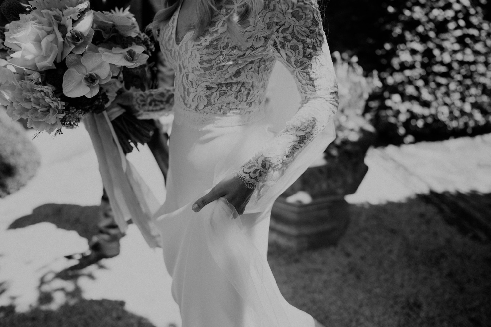 The dress skirt is made from 100% Italian silk and the top is made from French alencon lace. It has a low v shaped back and long sleeves. It has a hidden zip at the back of the skirt. At the waist it has an alencon lace waist band detail. It is fully lined and extremely light to wear and falls beautifully and is extremely flattering. It has a small train. I wore nude nipple covers which you couldn’t see in any of the photos, along with high waisted nude underwear.