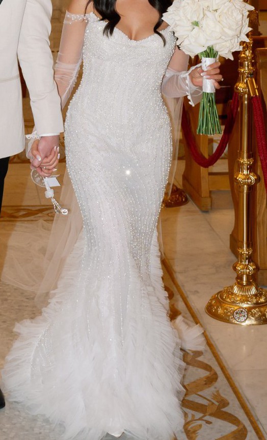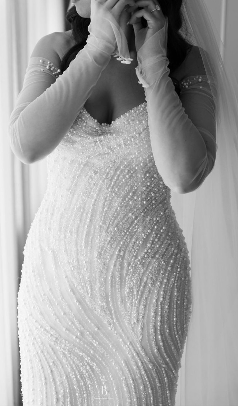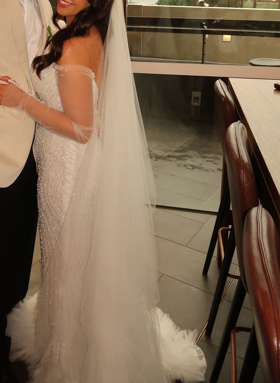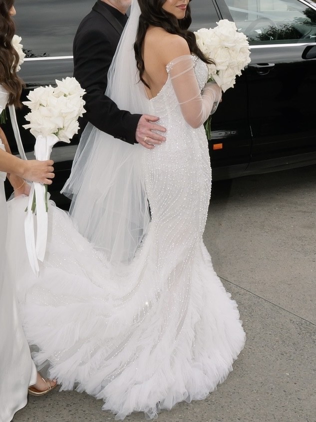 Long sleeve fitted wedding gown by LEAH DA GLORIA is decadent with a pearl bodice and ethereal tiered tulle ruffles. LEAH DA GLORIA veil and original coat hanger also included. Both the dress and veil have been dry cleaned.