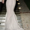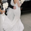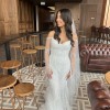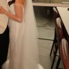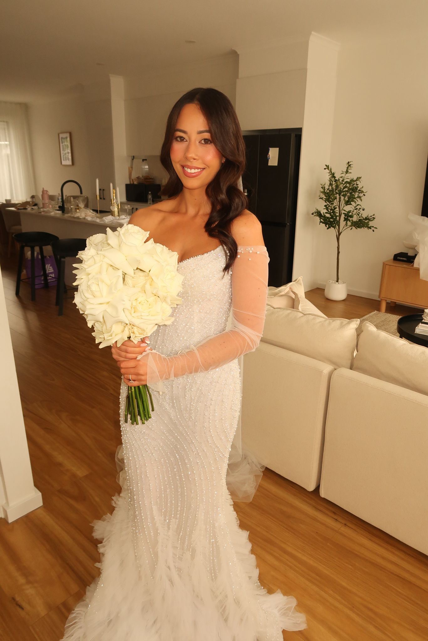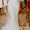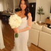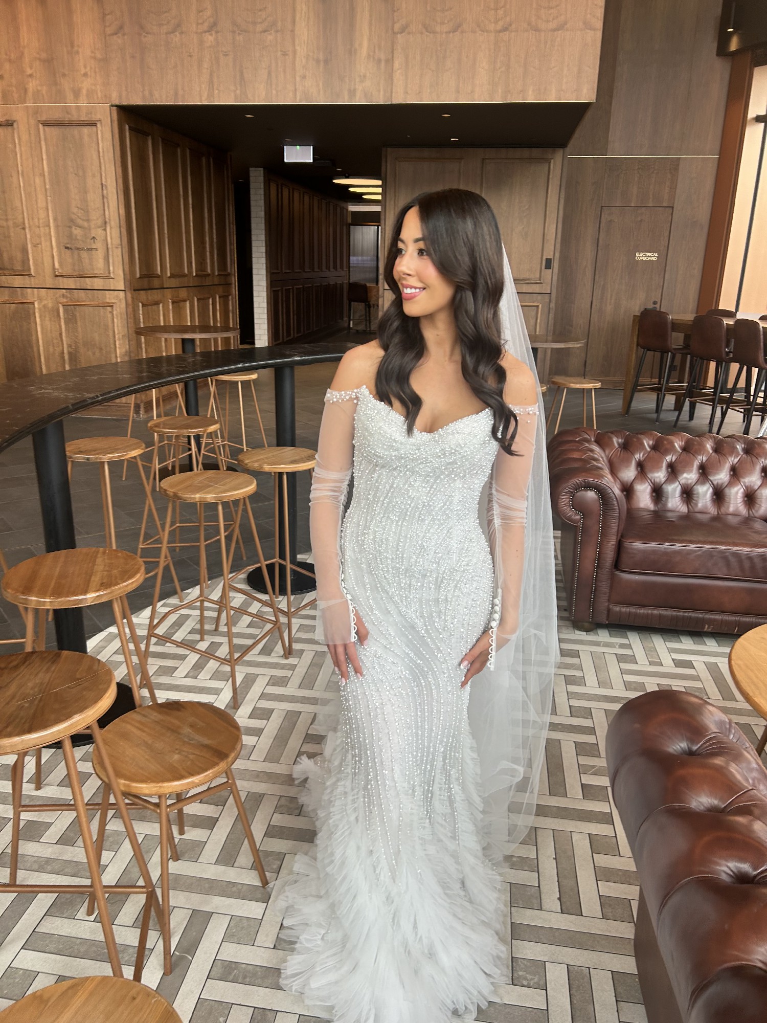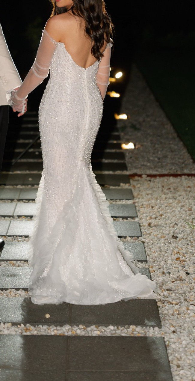 Long sleeve fitted wedding gown by LEAH DA GLORIA is decadent with a pearl bodice and ethereal tiered tulle ruffles. LEAH DA GLORIA veil and original coat hanger also included. Both the dress and veil have been dry cleaned.