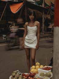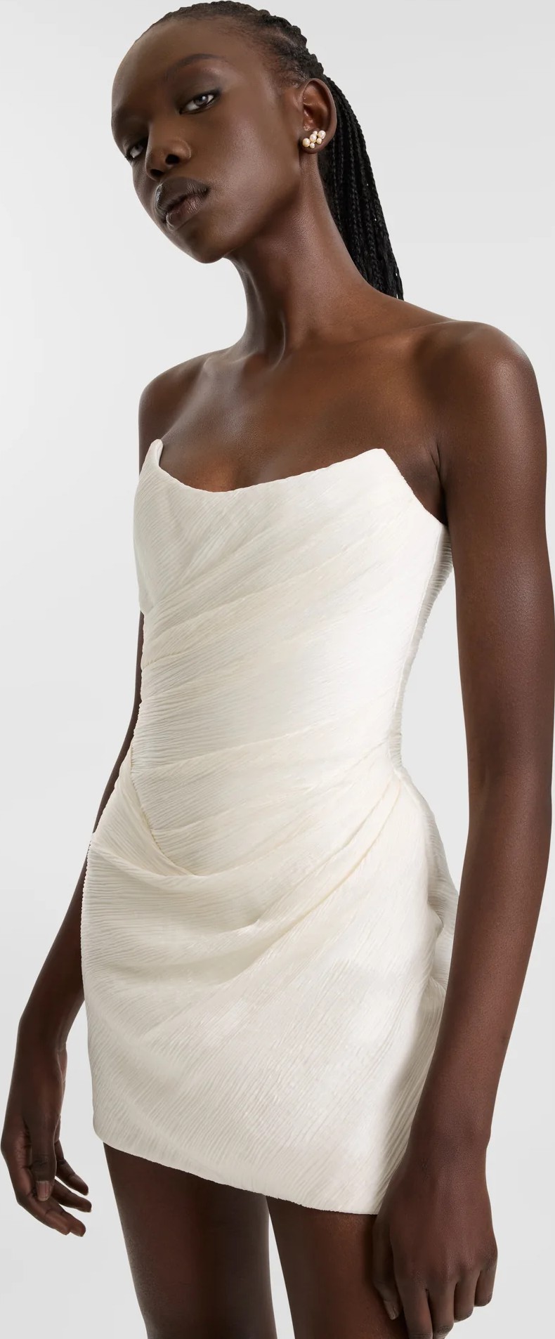 Beautiful KYHA Astor mini from the most recent 'Waterlines' collection. This mini features a softly scooped neckline, structured corset designed to cinch the waist and playful mini skirt. Effortlessly draped in plissé, Astor brings together softness and structure in a single sartorial moment for your second look.