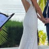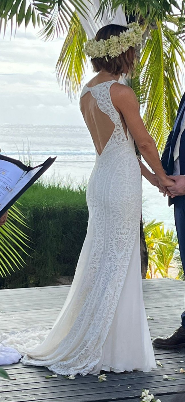 If you're looking for a gown that screams summer, beach or destination wedding - this Grace Loves Lace “Chelo” is an absolute stunner. Beautiful, intricate (but sturdy) ivory lace with ivory lining (not the chai lining as shown in stock photos), flowing silk chiffon panels and a gorgeous (easily manageable) train.