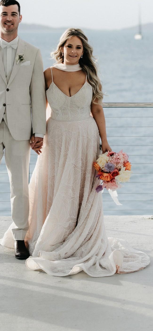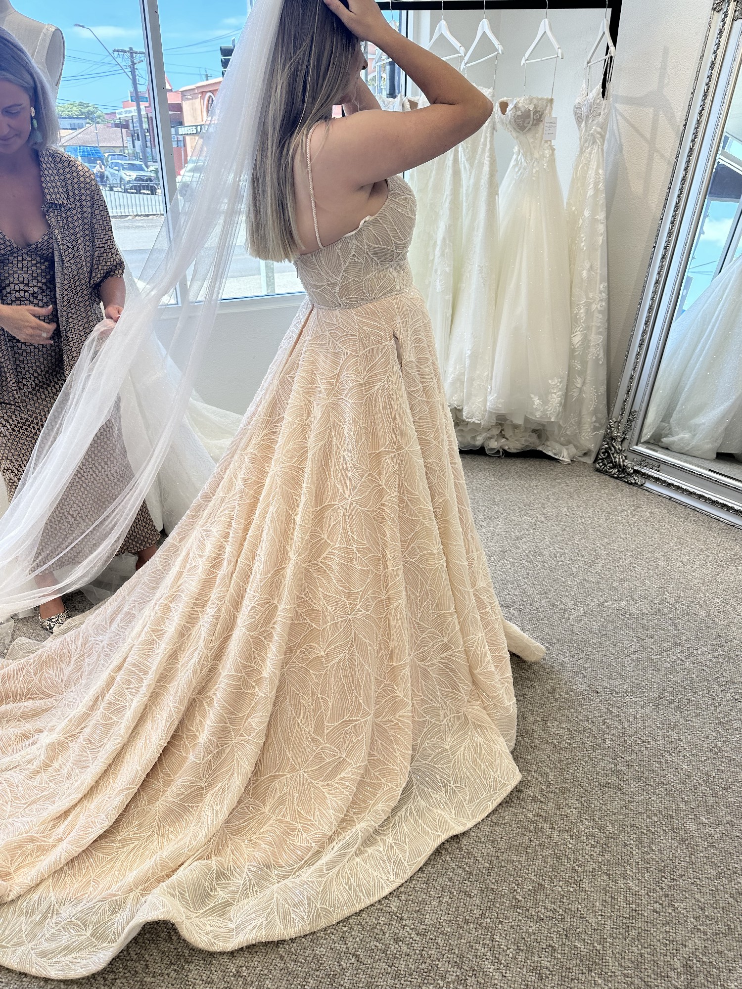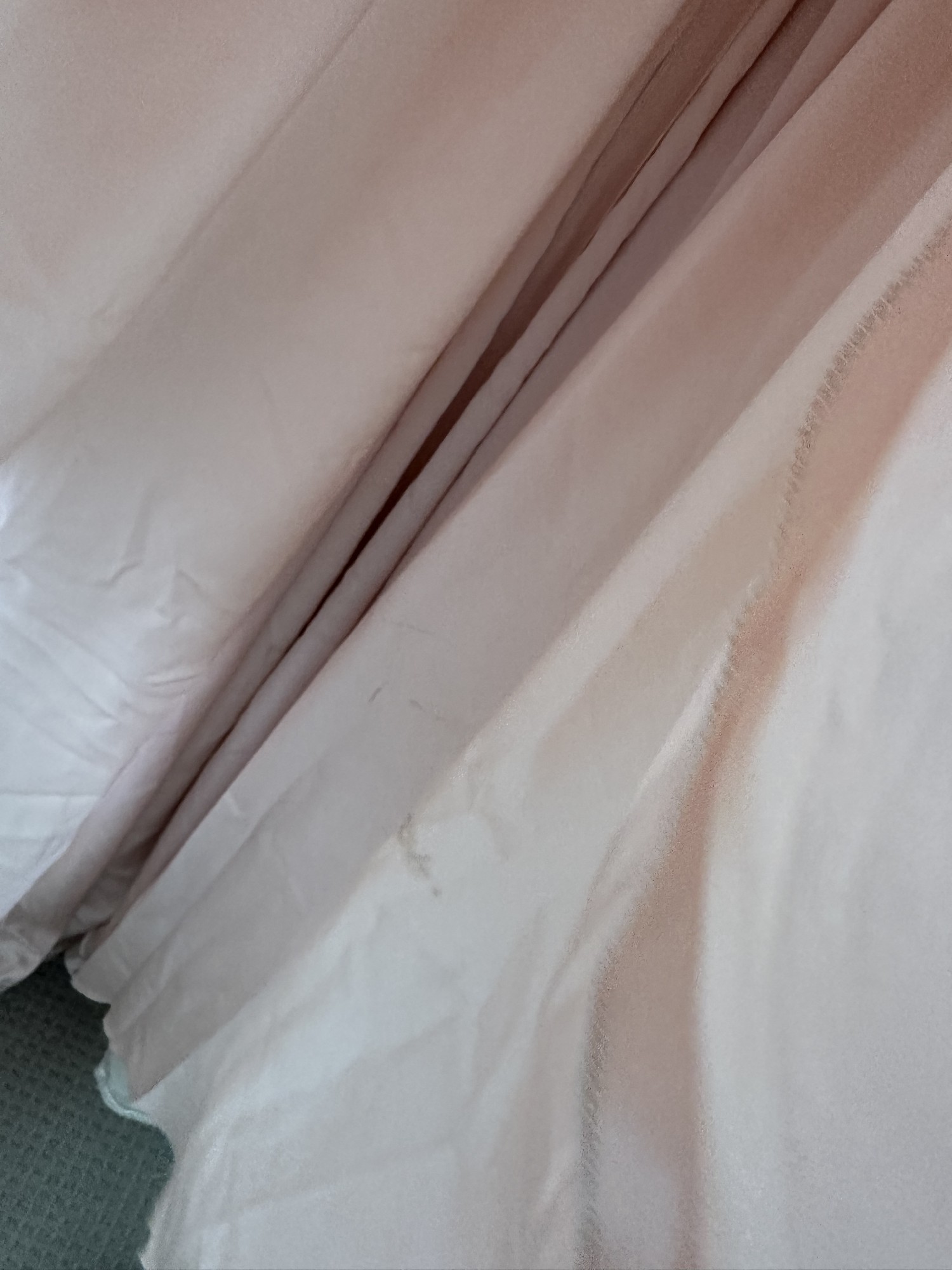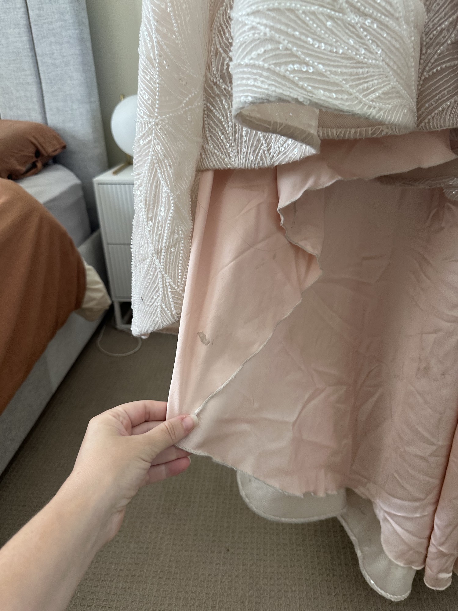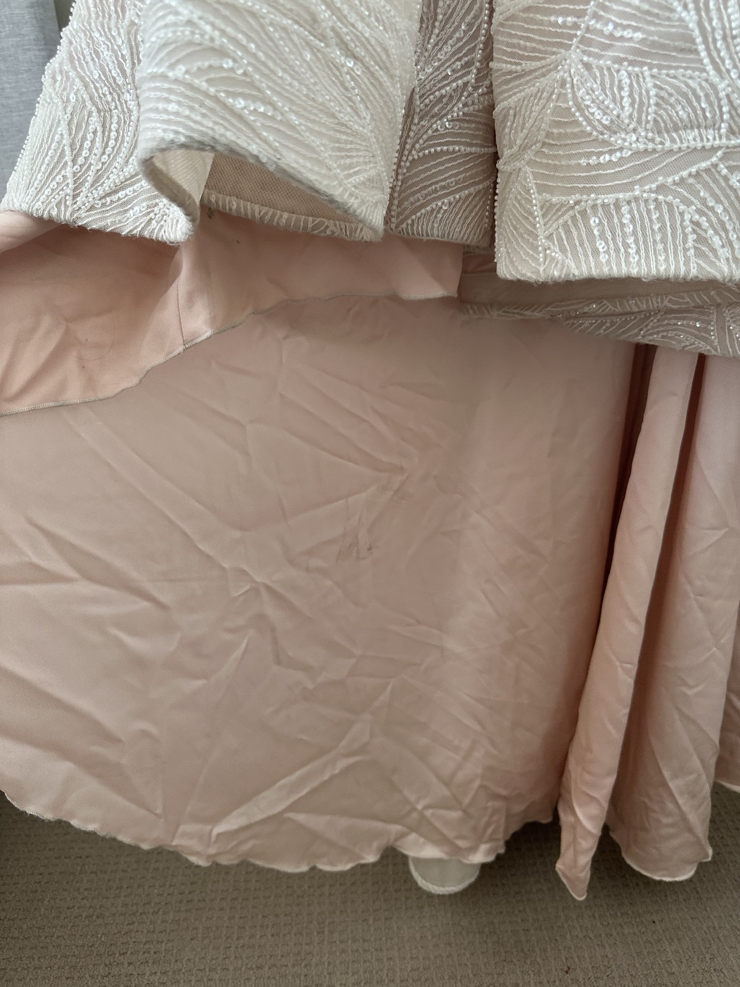 Selling my beloved wedding dress. It has a slight pink undertone which is unique but still very bridal. Received comments that it was the nicest dress people had ever seen :) which I agree but will let you be the judge. Have had it altered only slightly, mainly a hem and the straps shortened. Have two capes I am also willing to send for free valued at $200 per item. One pink/champagne as pictured and another ivory. Can send extra photos as requested. The dress has minor stains on the underside which have absolutely no impact to how the dress looks.