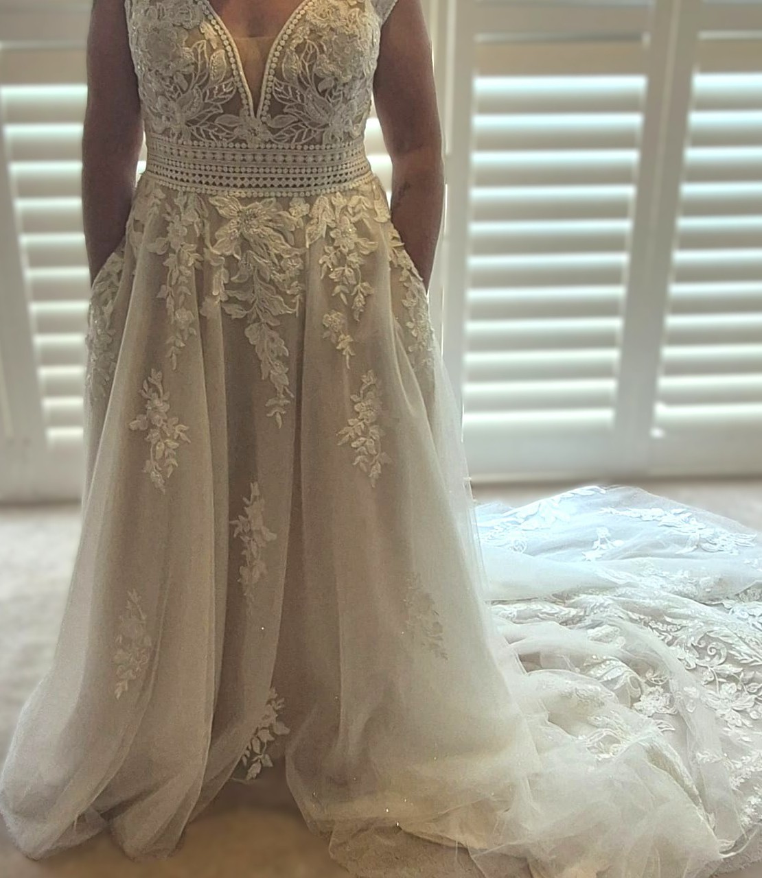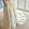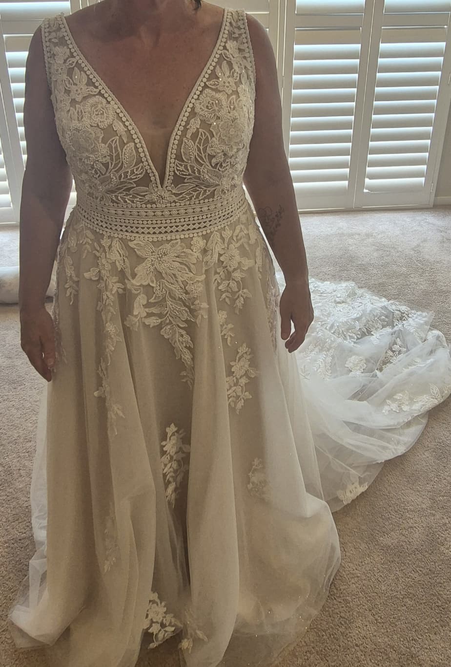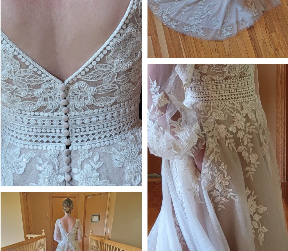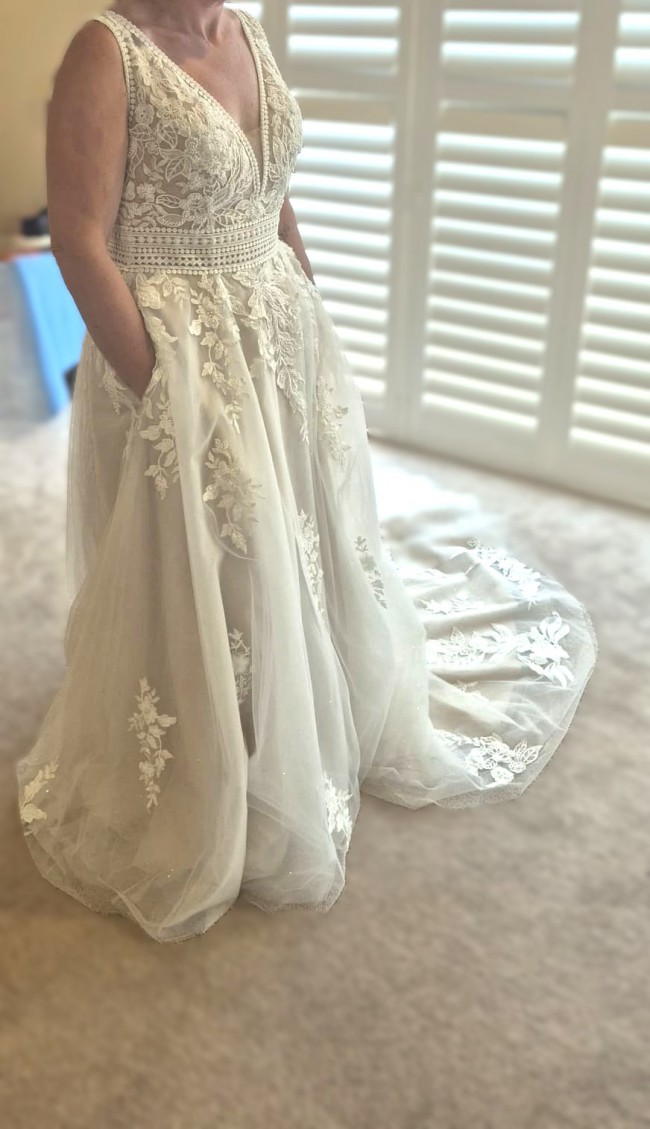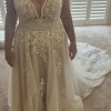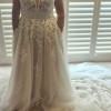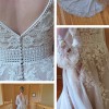 Private Label Design Wedding dress with detachable bishop sleeves as an alternative option. There is a stunning beaded floral bodice with a beautifully crocheted belted waist. The floral design trickles down from the waist, creating a beautiful, flowing design. The deep V neckline is adorned with very unique beads. The bodice has built-in cups and boning for great support. There is a mocha colored underlayer, giving some subtle colour to the dress. This dress is very unique and stunning. It is labelled as US 16.