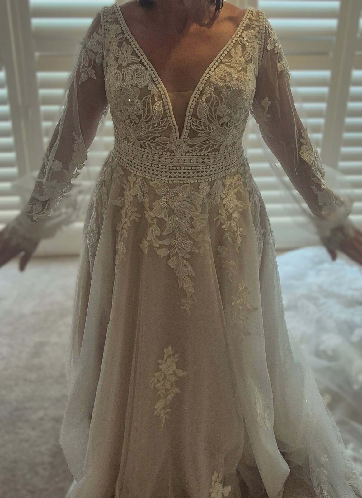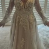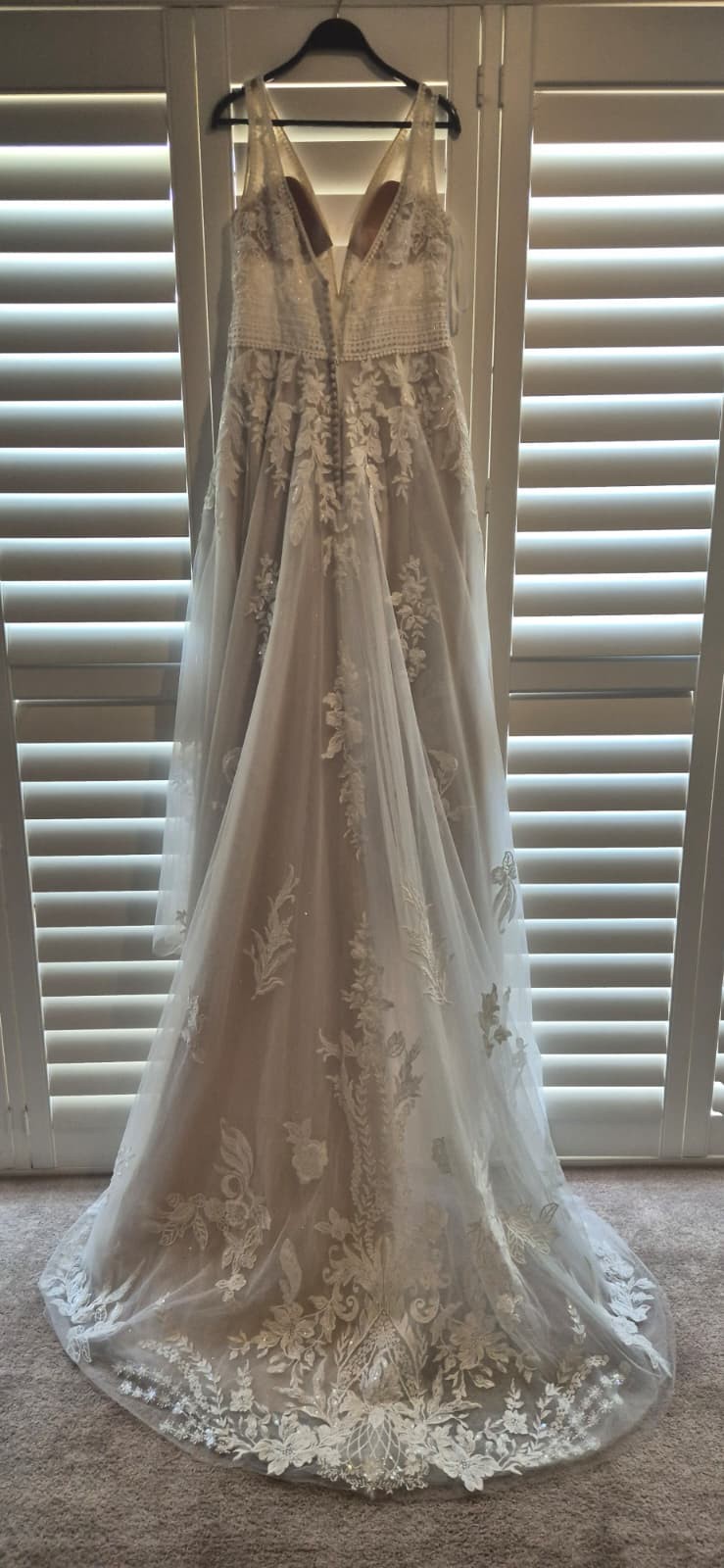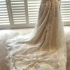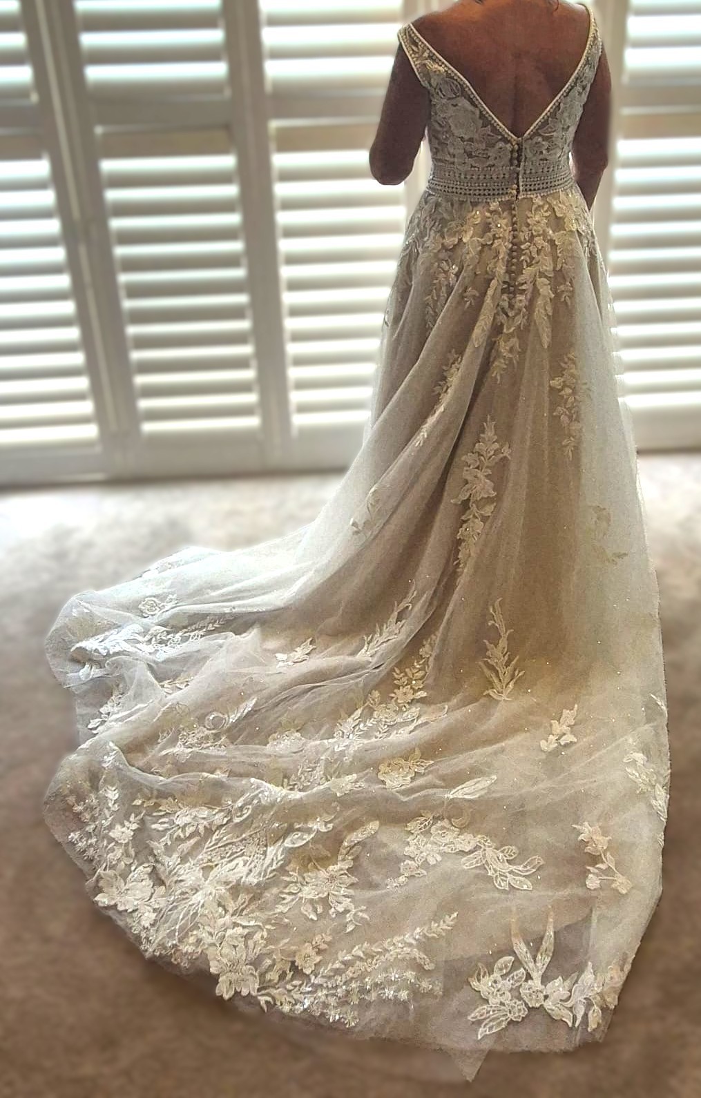 Private Label Design Wedding dress with detachable bishop sleeves as an alternative option. There is a stunning beaded floral bodice with a beautifully crocheted belted waist. The floral design trickles down from the waist, creating a beautiful, flowing design. The deep V neckline is adorned with very unique beads. The bodice has built-in cups and boning for great support. There is a mocha colored underlayer, giving some subtle colour to the dress. This dress is very unique and stunning. It is labelled as US 16.