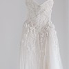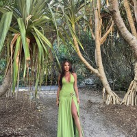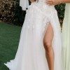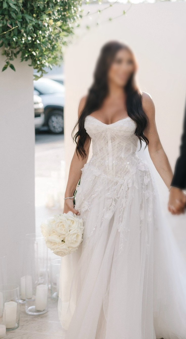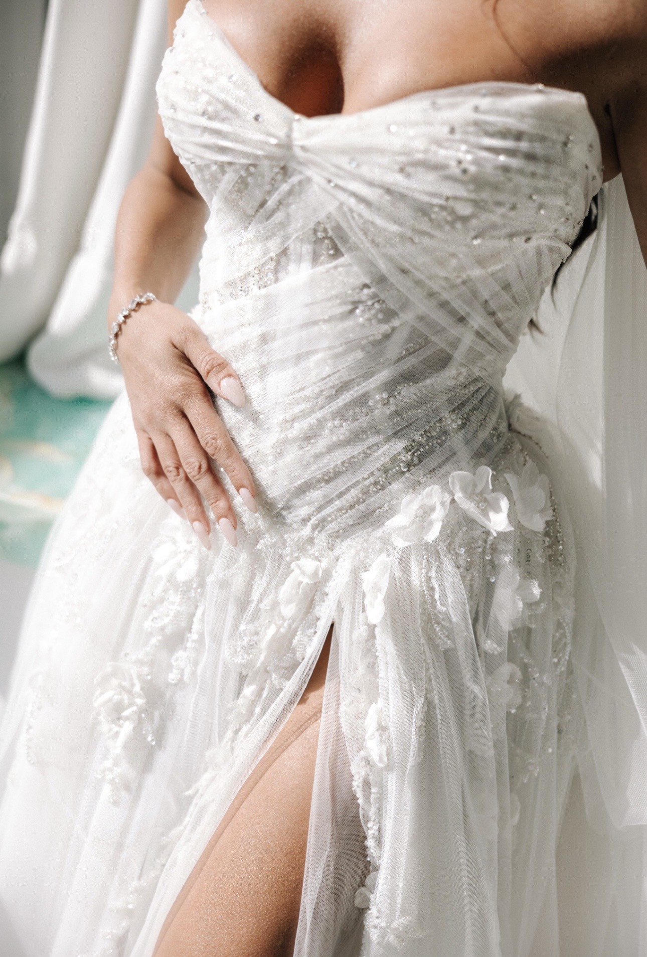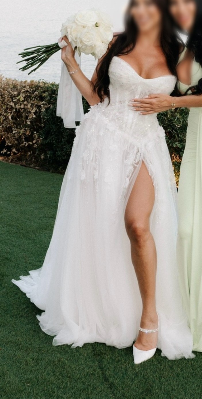 An ivory COUTURE gown that hugs, drapes, and moves beautifully. The sculpted bodice is wrapped in soft tulle with delicate sparkle, flowing into a sheer skirt with floral detailing and a confident high slit. Romantic, flattering, and made to turn heads.