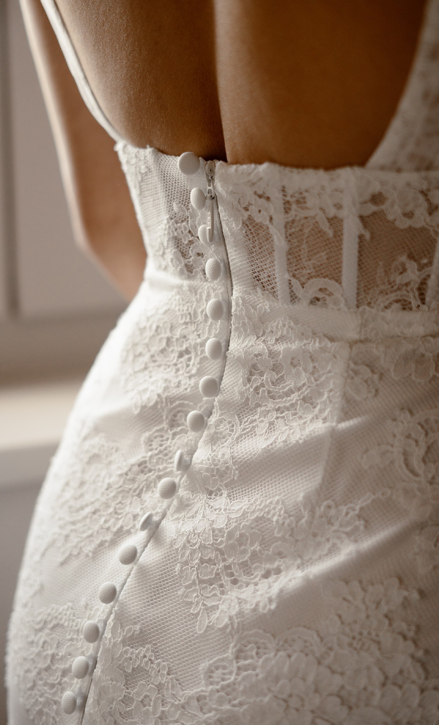 The square low back is stunning, and the button detail on the back are perfection!! There is an invisible zip so you don't need to worry about the fussiness of the buttons on the day.