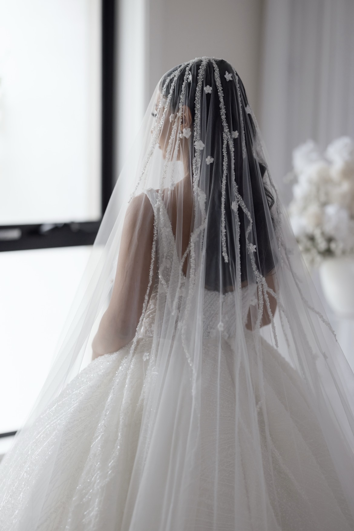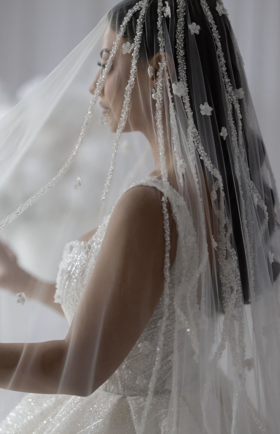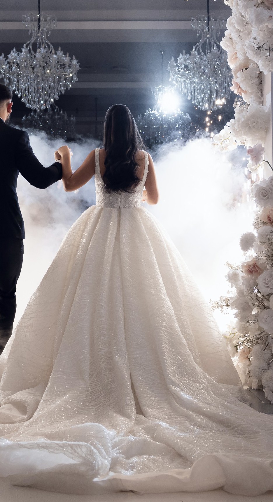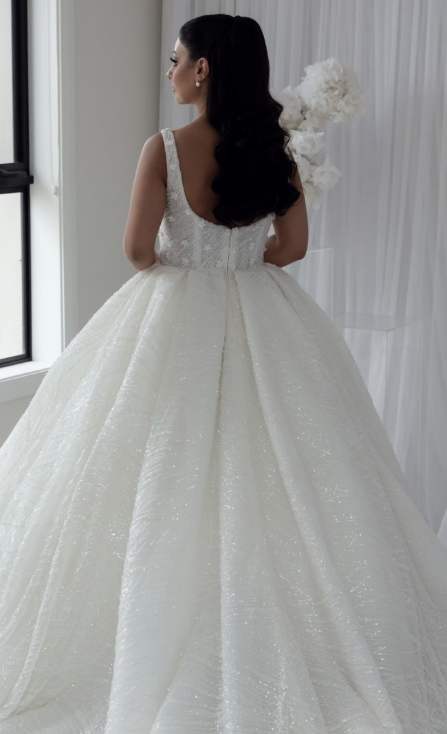 What truly sets this dress apart are the enchanting 3D flowers that cascade throughout the bodice, creating a breathtaking display of texture and dimension. Adorned with sparkling crystals, pearls, beading, and sequins, each detail catches the light, ensuring that you will shine on your special day.