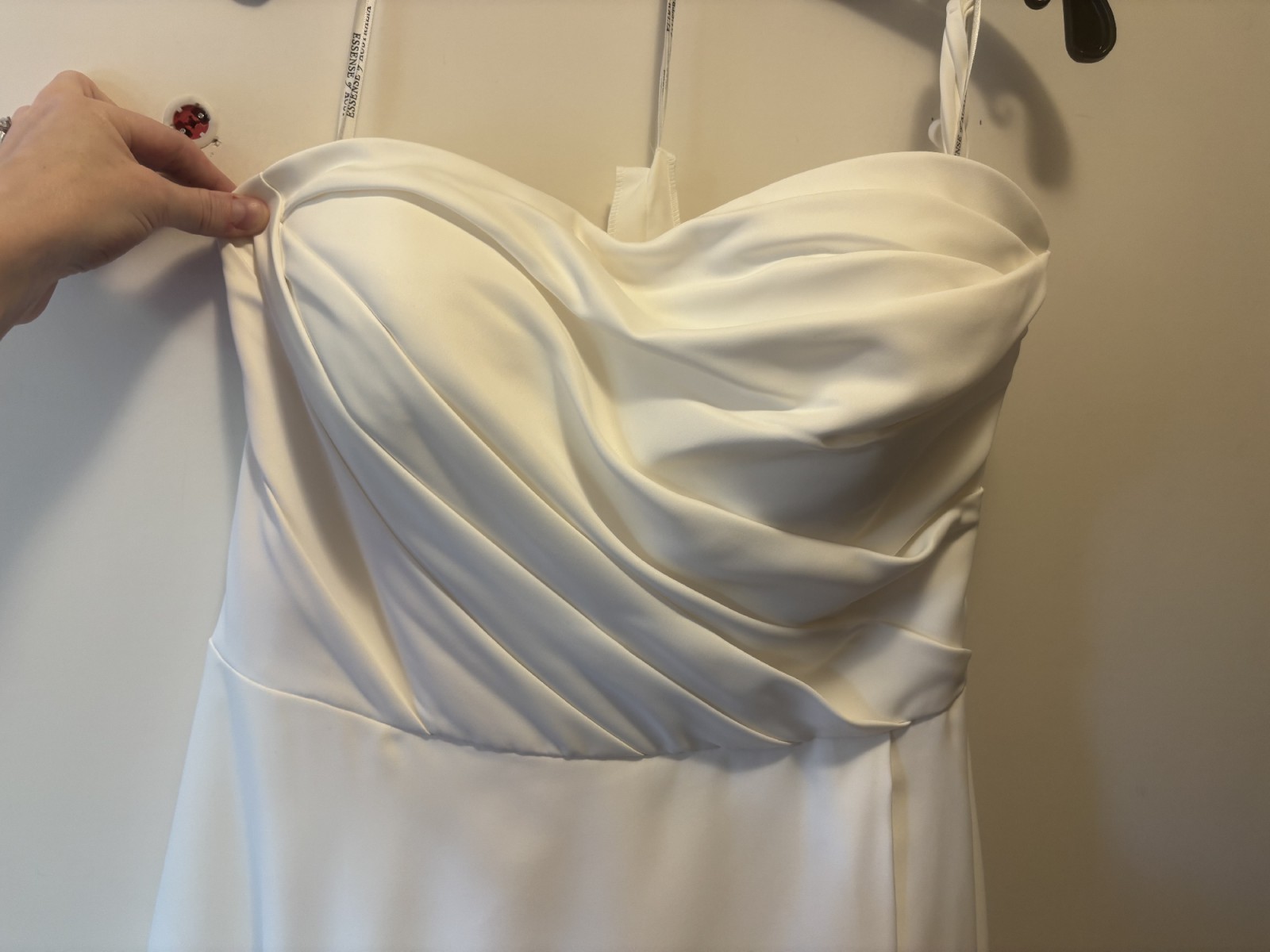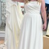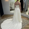 Crafted from luxurious ivory satin, the fabric drapes beautifully, casting an ethereal glow as you twirl in celebration. The strapless design showcases the shoulders, allowing for elegant accessories to shine. One of the stunning highlights of this dress is the detachable sleeves, which offer versatility for your ceremony and reception—a whimsical touch that allows you to alter your look with ease.