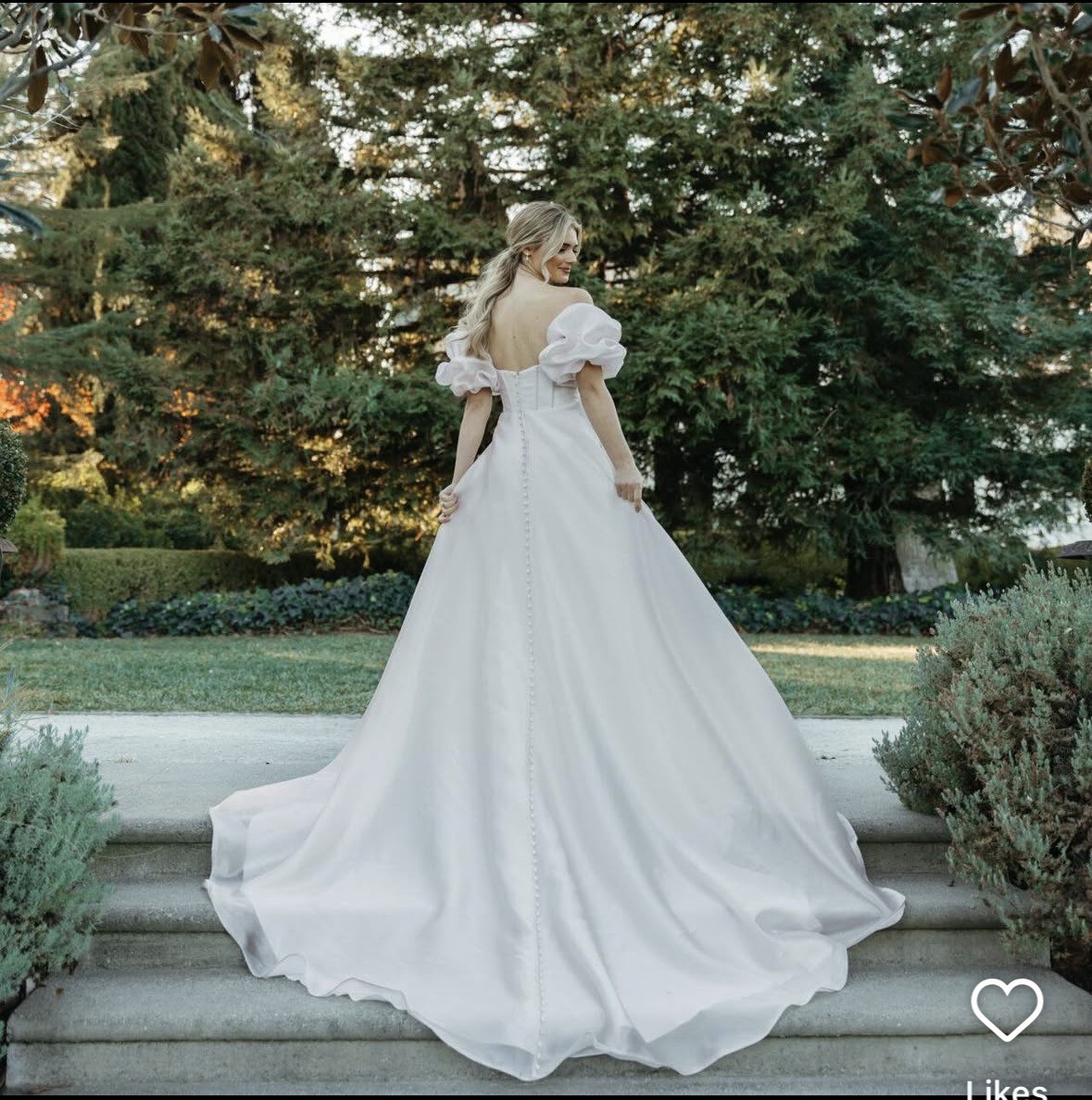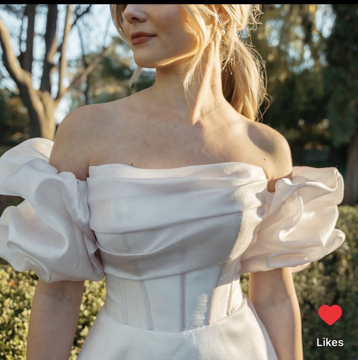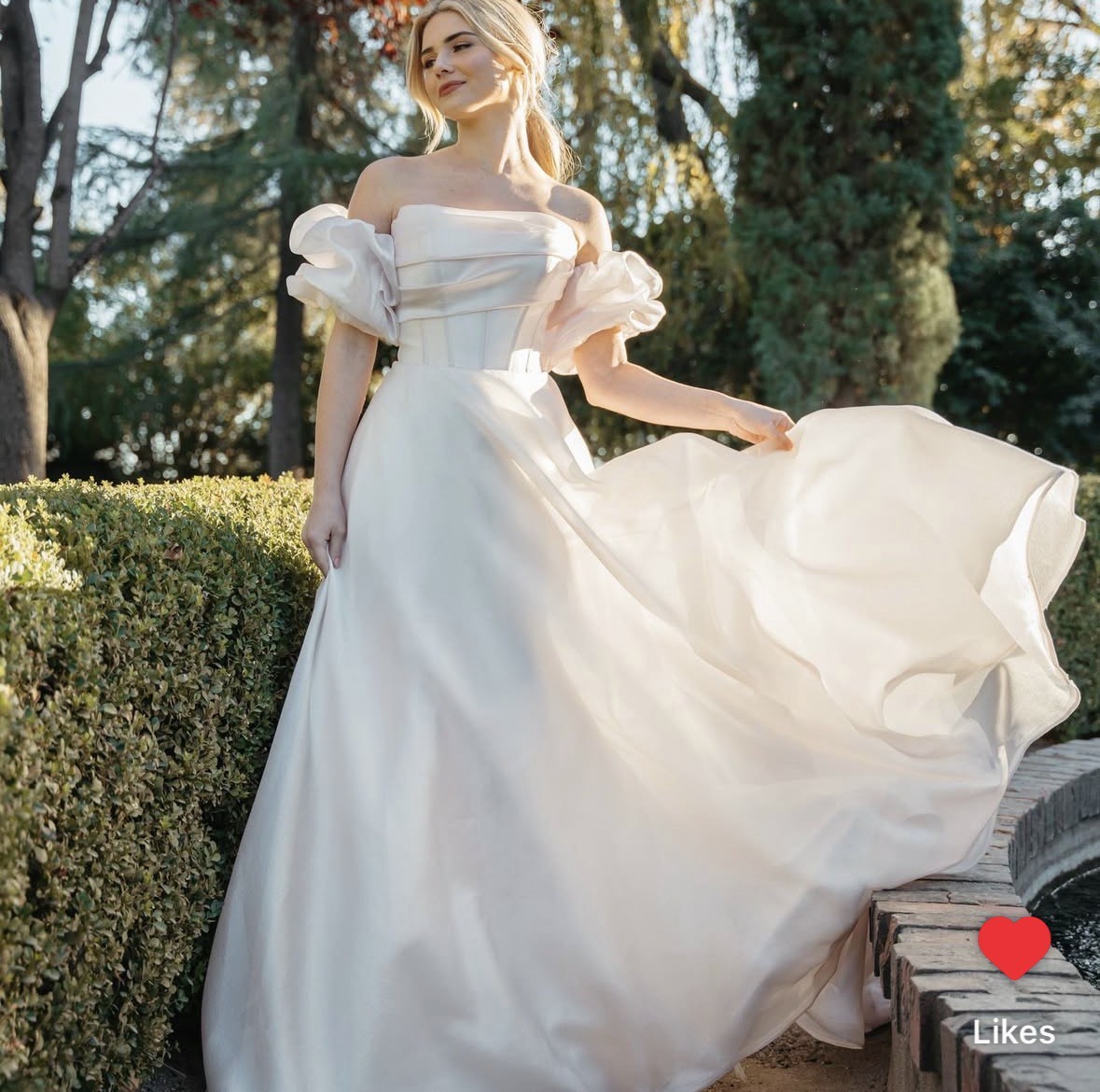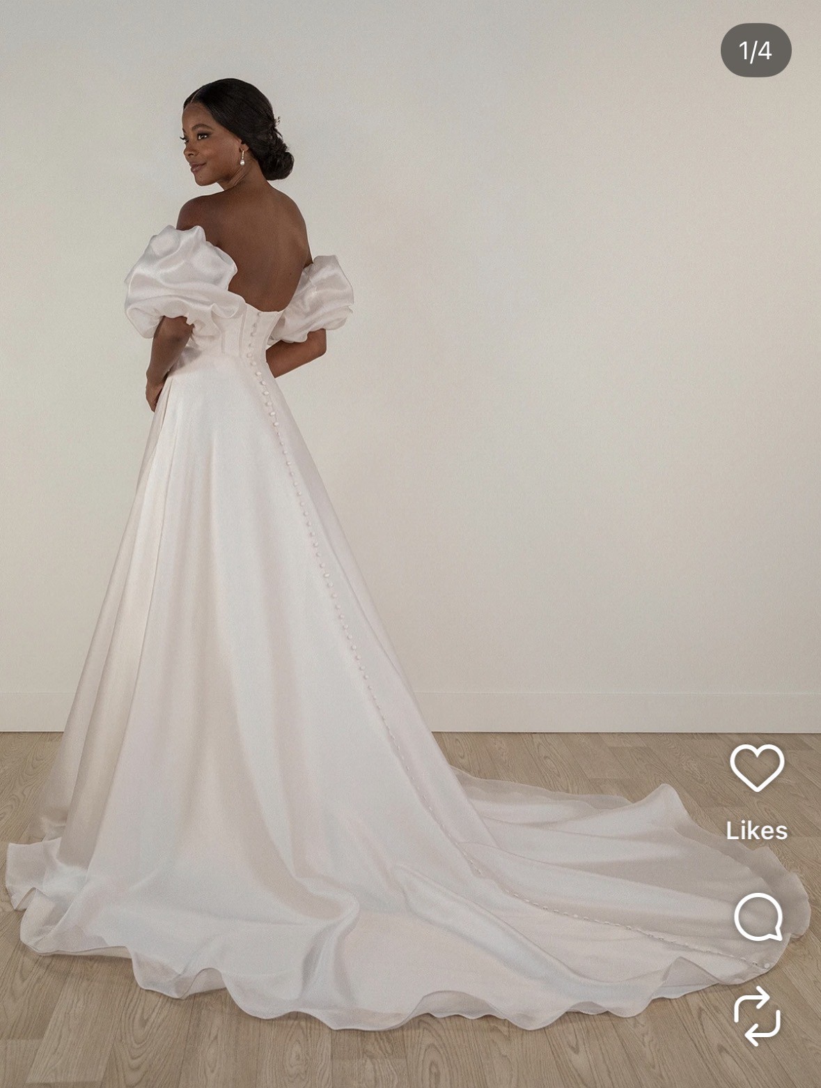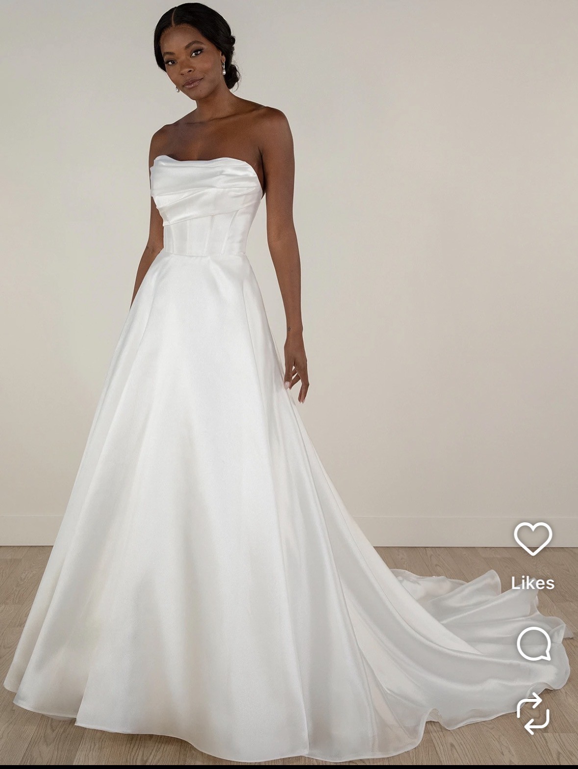This gown has been carefully stored and is ready for its next bride. Ideal for someone looking for a modern, versatile dress that combines comfort, style, and functionality.