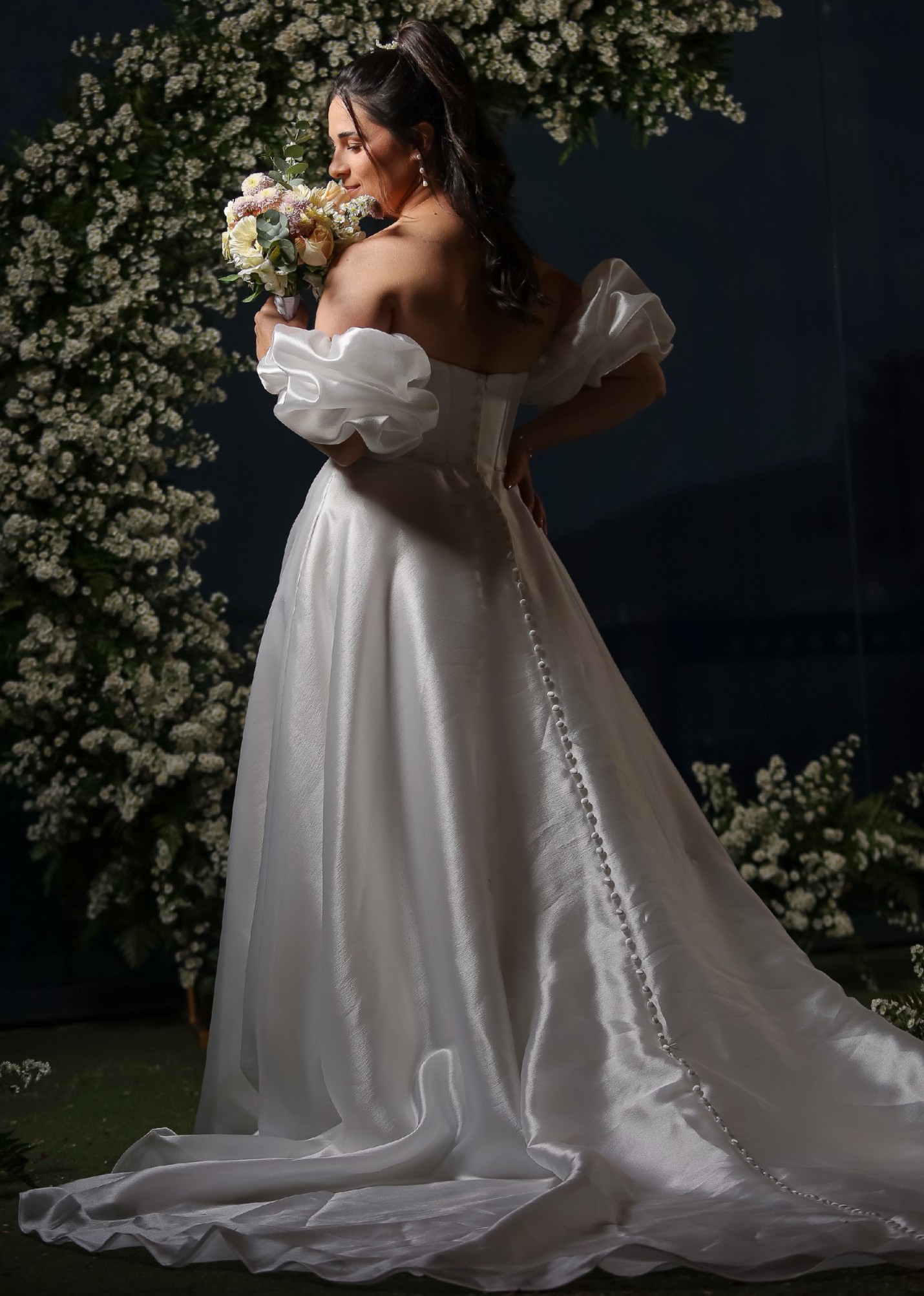 The dress features practical hidden pockets (perfect for keeping essentials close like your vows or a tissue) and elegant detachable sleeves, allowing you to switch between two looks effortlessly. The ivory colour is timeless and photographs beautifully.