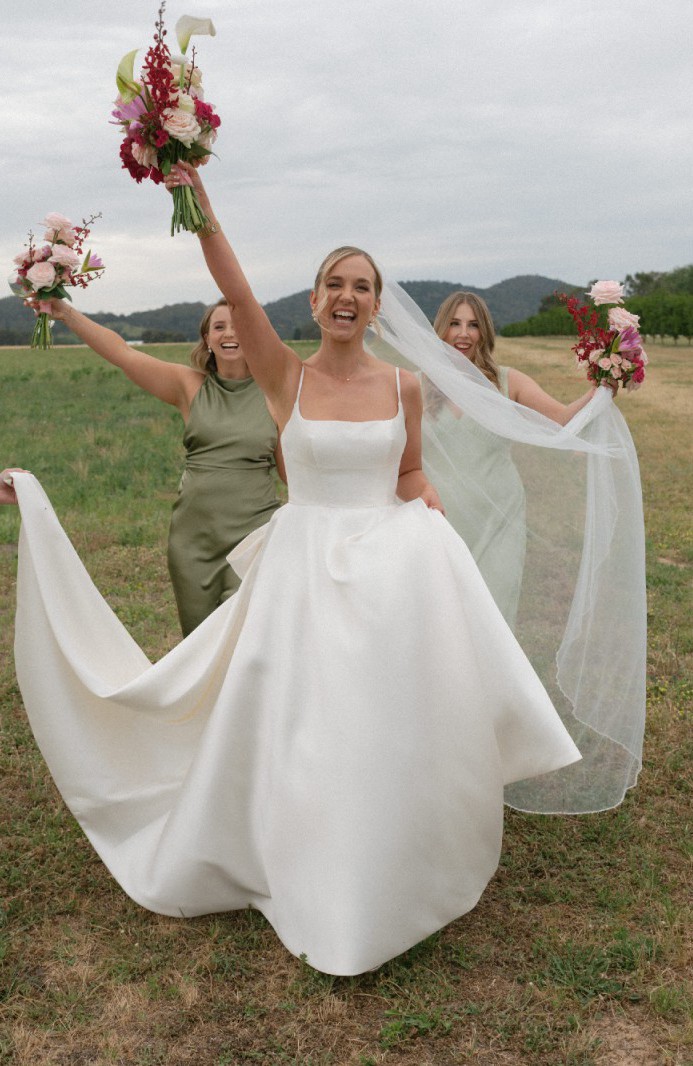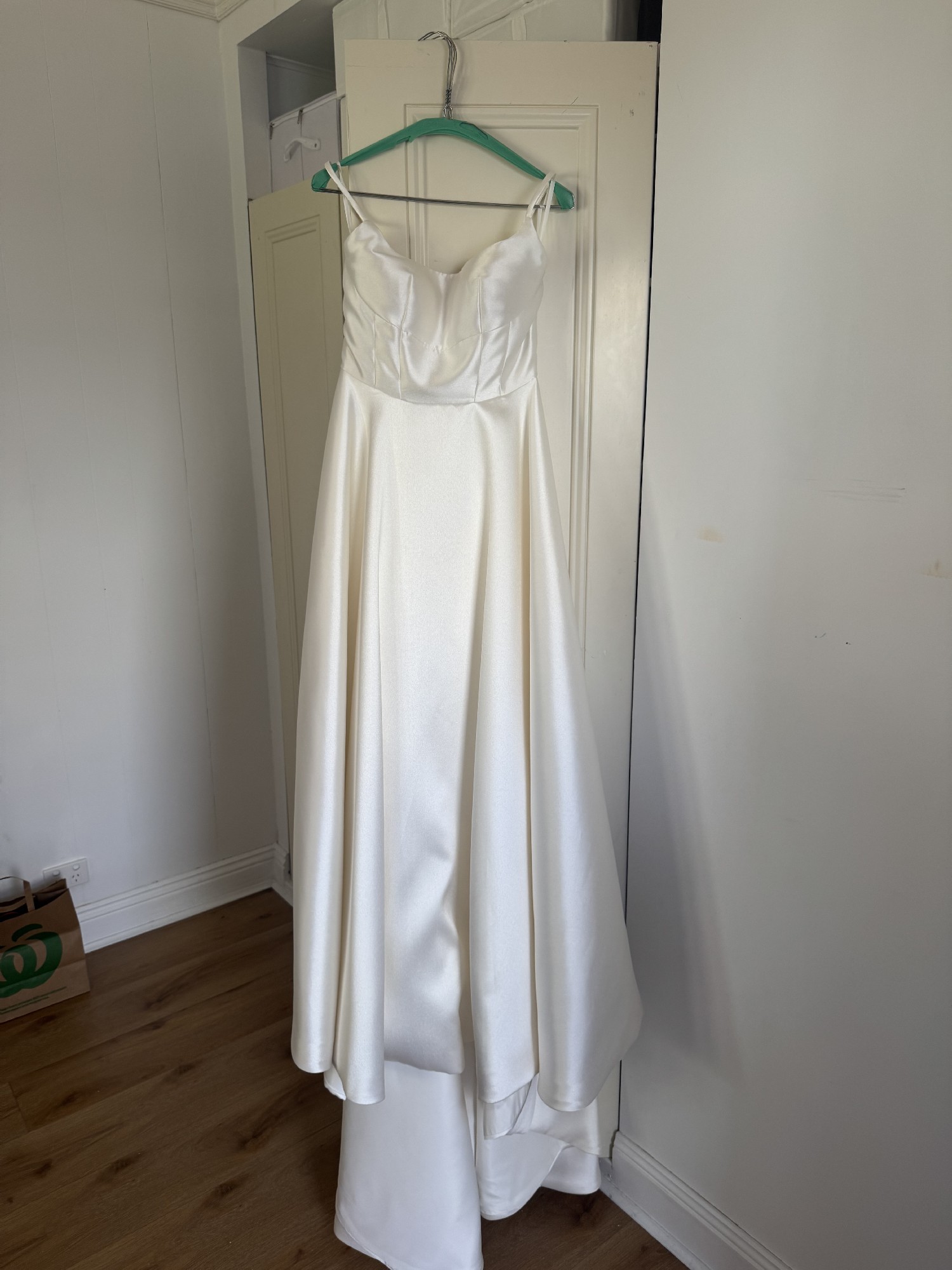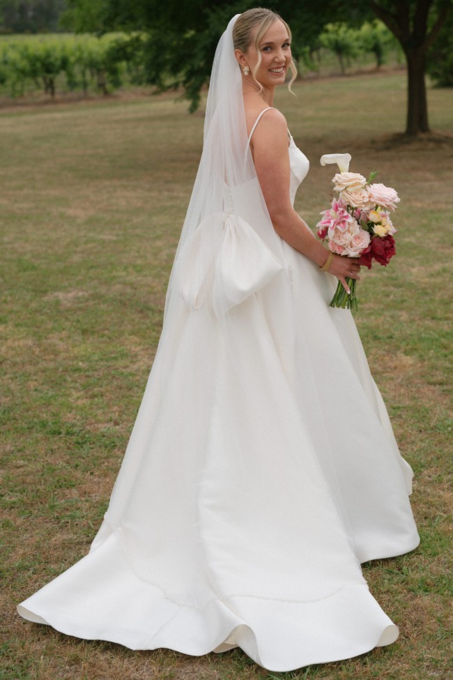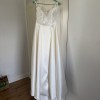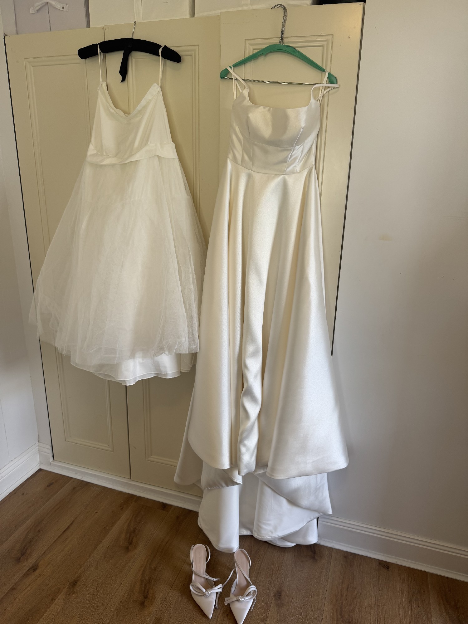 Selling my beautiful, ivory, Freda Bennett ‘Logan’ dress. The bodice is a size 10 and I am typically a size 10-12 and am 169cm / 5ft 7 tall. I have listed the alterations below, which included inserting an under-the-skirt bustle (see picture from the back where the dress is bustled). The bow at the back and the tulle under skirt are both removable. The picture of the dress and underskirt hanging on the wall was taken after the wedding and after the dress was Dry cleaned. The shoes are an unworn optional extra (size 9.5) - I accidentally forgot to bring them to the wedding and would love to see someone wear them! I also have two veil options (the one I wore and a bonus option) that I am willing to include for free.