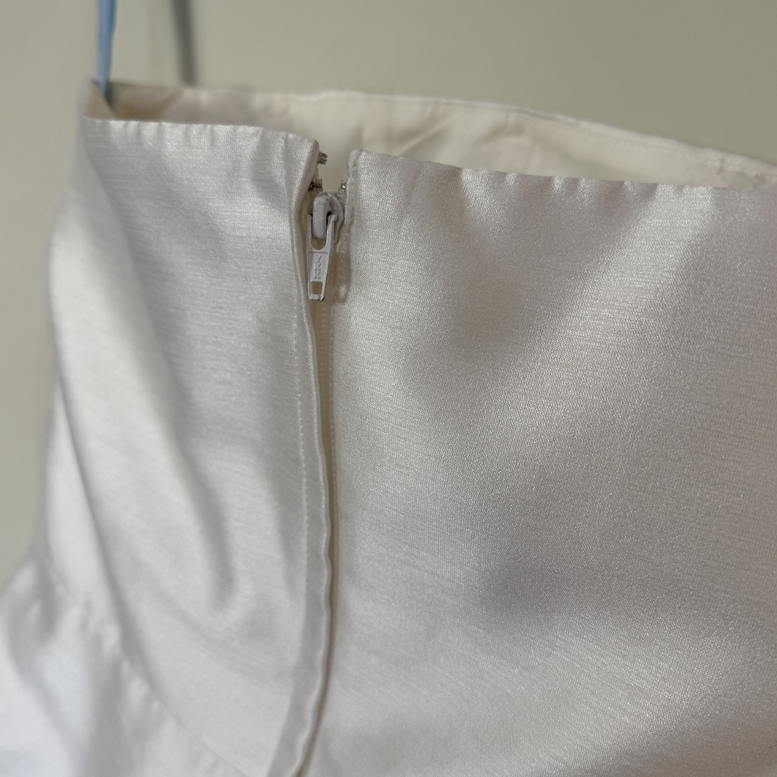 Floor length train on right side with hook and eye to hold it up higher off the ground