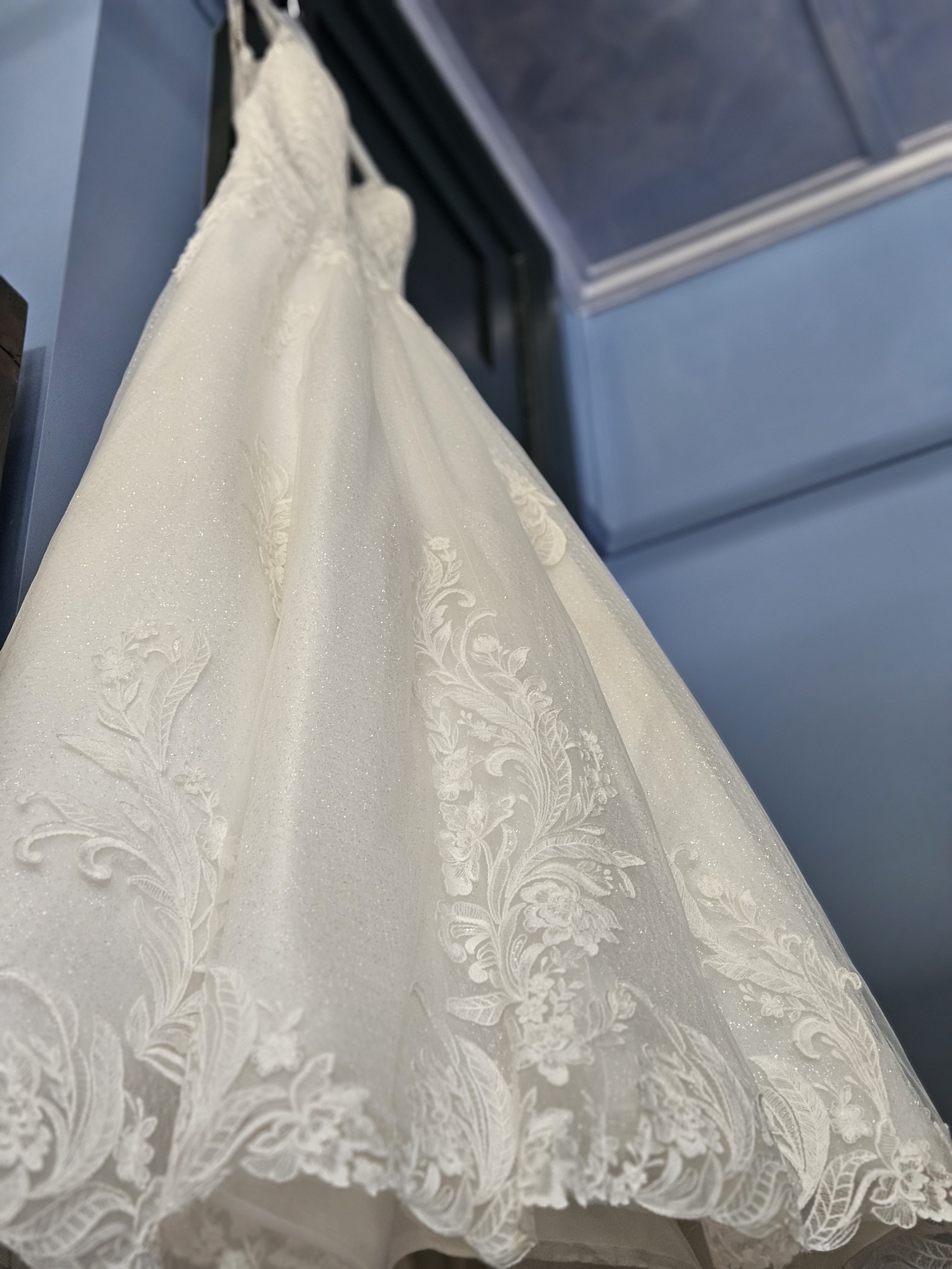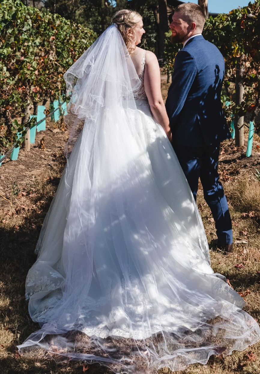 This breathtaking Rory gown by Maggie Sottero is the perfect blend of elegance and romance. From the moment I slipped into it, I felt like a true bride. The A-line silhouette gracefully flows to the floor, allowing for effortless movement while showcasing a stunning ivory lace all the way to the end of the train that adds a touch of vintage charm. The train can be bustled with three discrete buttons, and I did not need to have the skirt length changed.