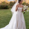 This stunning ballgown by Karen Willis Holmes captured my heart the moment I tried it on, and I hope it will do the same for you. With its exquisite curve neckline and elegant strapless design, this dress beautifully accentuates the figure while maintaining an air of timeless romance. The corset back adds a touch of drama and elegance, ensuring a perfect fit to make you feel both confident and gorgeous on your special day.