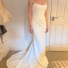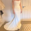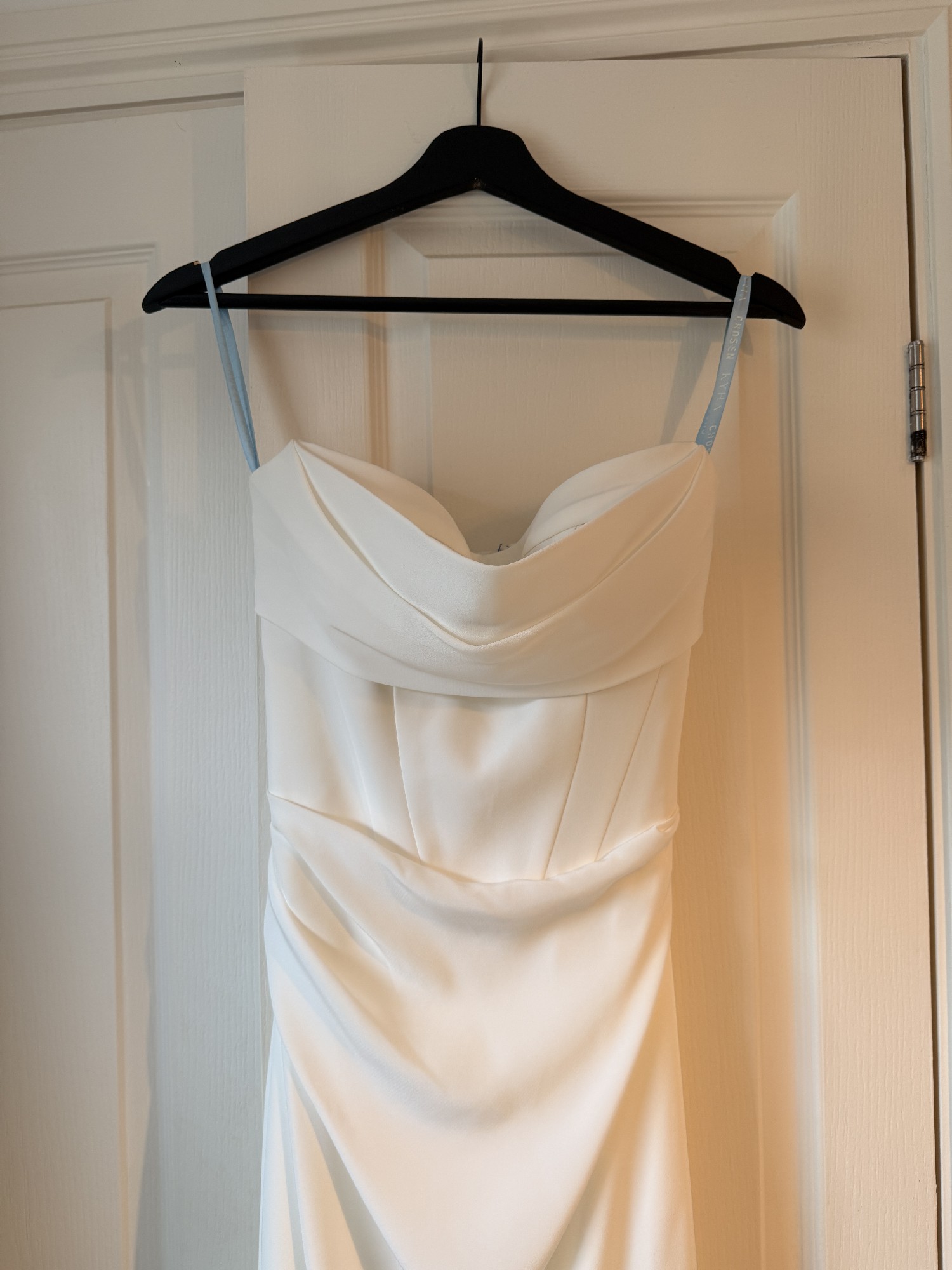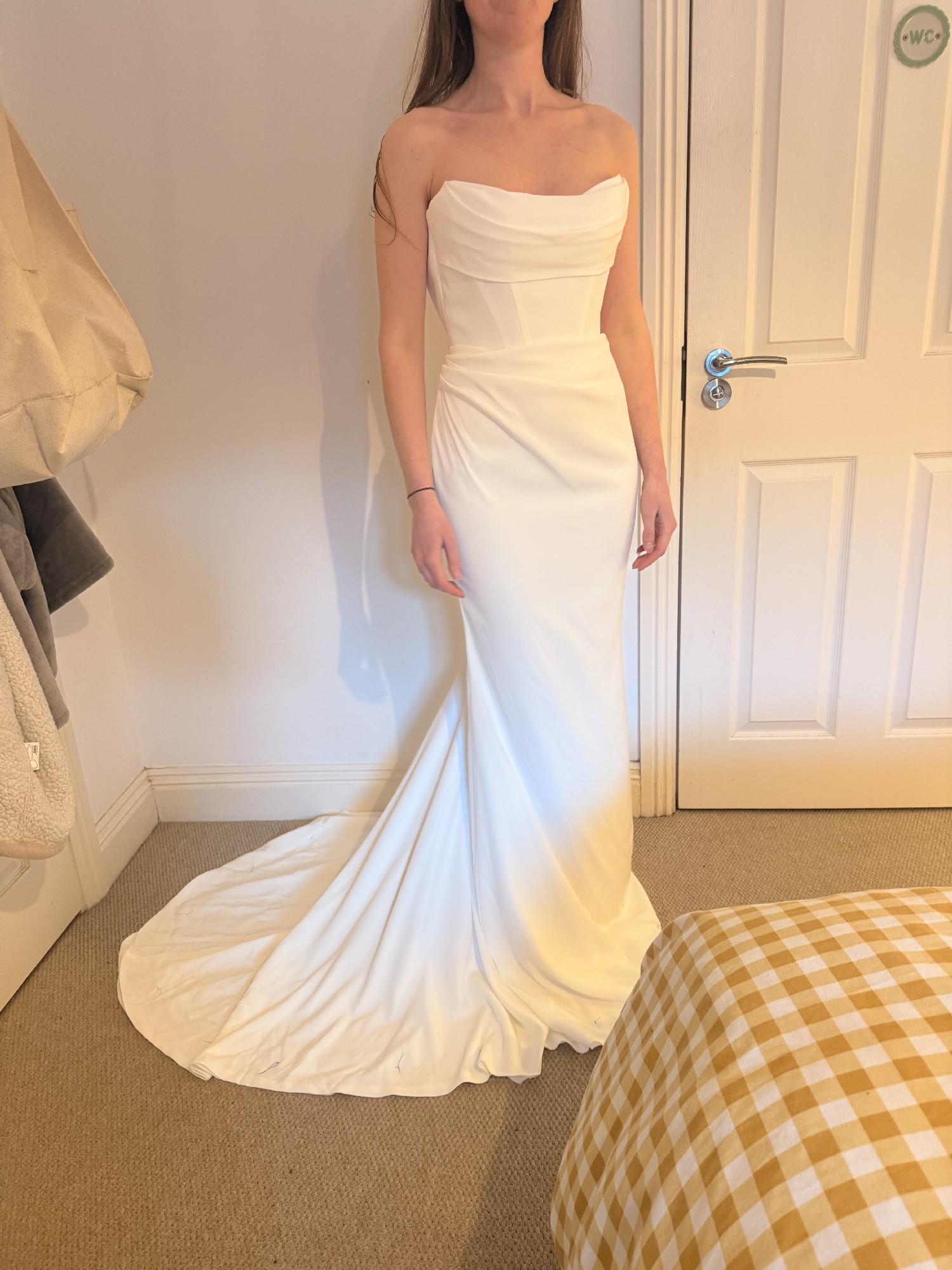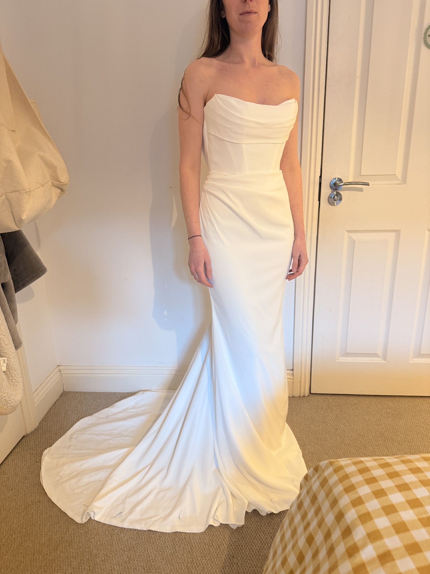 Wedding moved therefore sadly up for sale 🤍 grab a bargain! Fit for royalty, Duke sees contemporary couture meet sumptuous minimalism. Its structured, corseted bodice and fit and flare skirt cuts a statuesque figure. Cut from luxe triacetate and draped artfully across its scooped neckline and waistline, Duke masters the sartorial craft of elevated drama. Notes from alterations - these were pinned in place but all fabric remains • Sides taken in along original bone channel. • Boning moved, extra added & all reinforced. • Lining, mid layer & outer layer folded back – not cut as needed another appointment to confirm size and fit. • Hem is un-picked. Tacked in place at height to be shortened too at later date with shoes. • bodice and skirt attached with thread for ease access for future alterations. • waist loop tack thread loosely