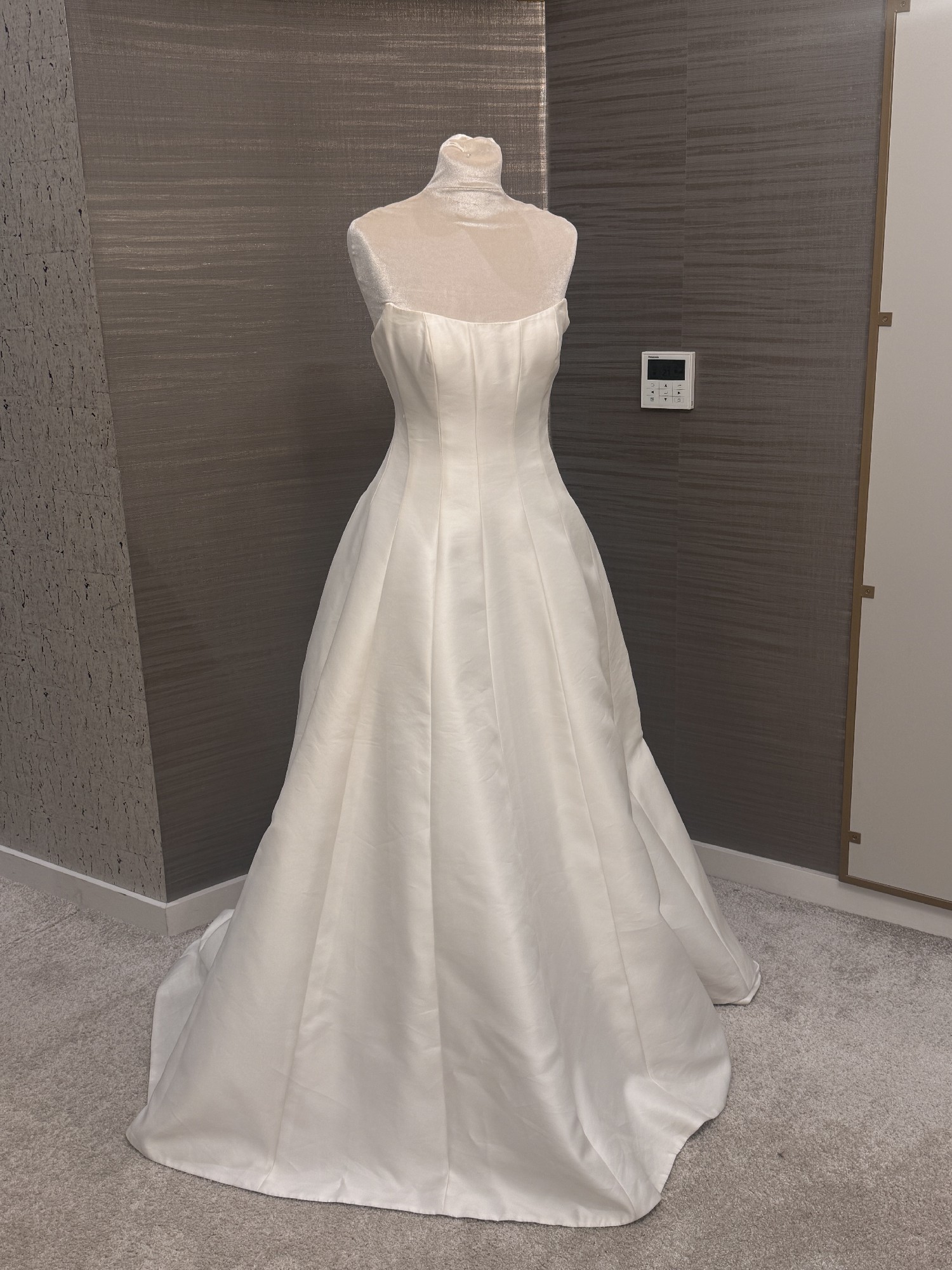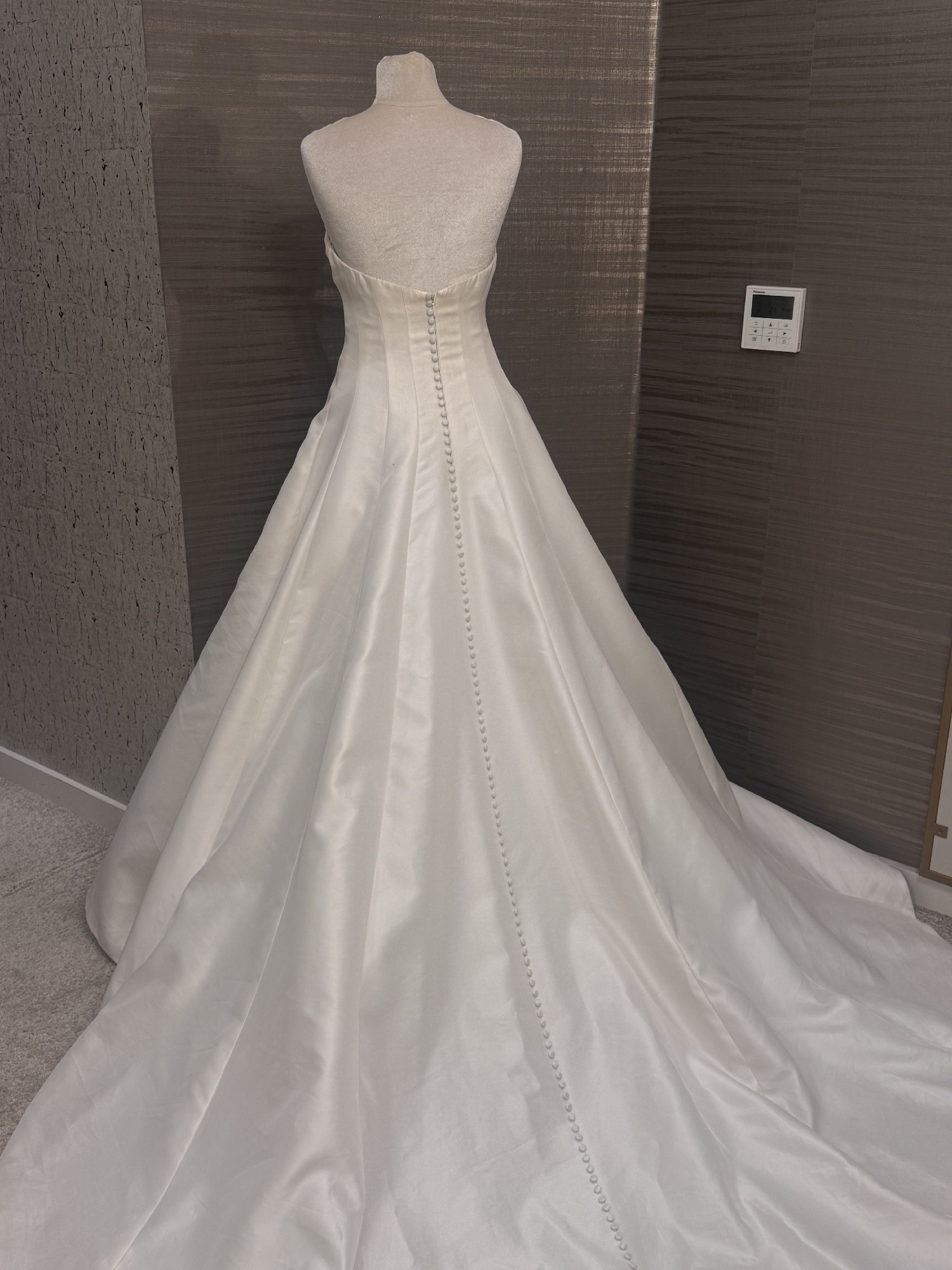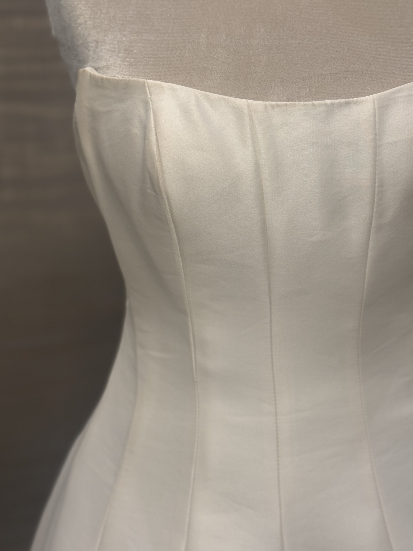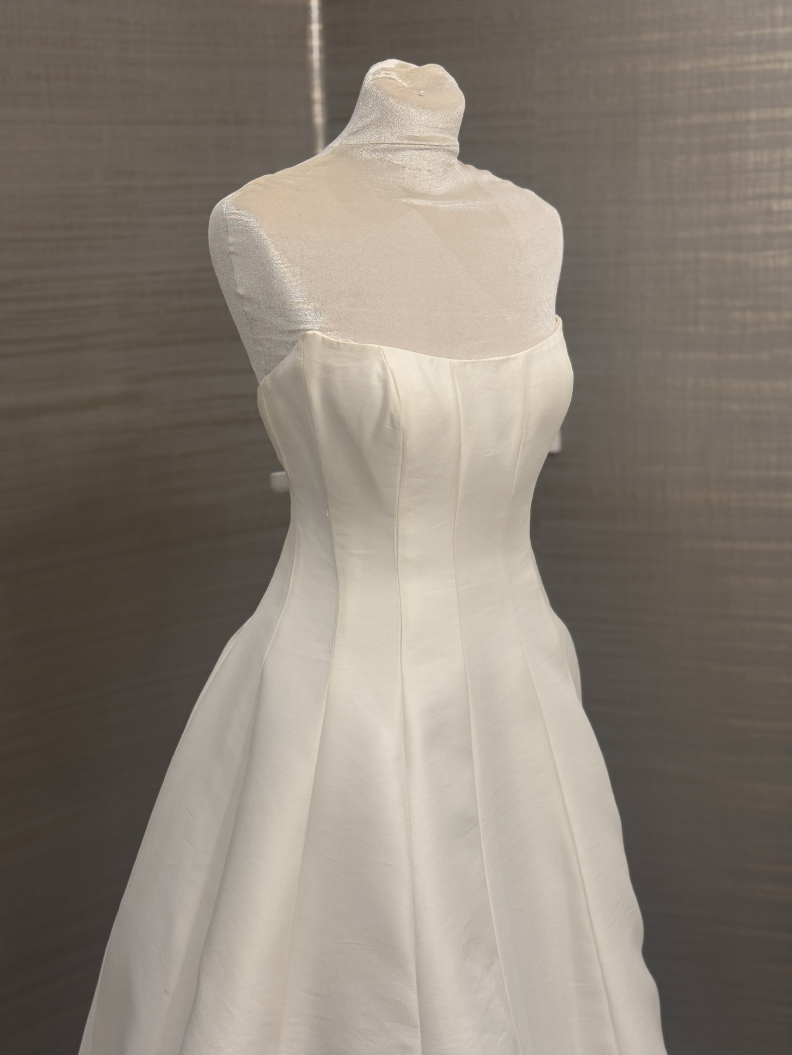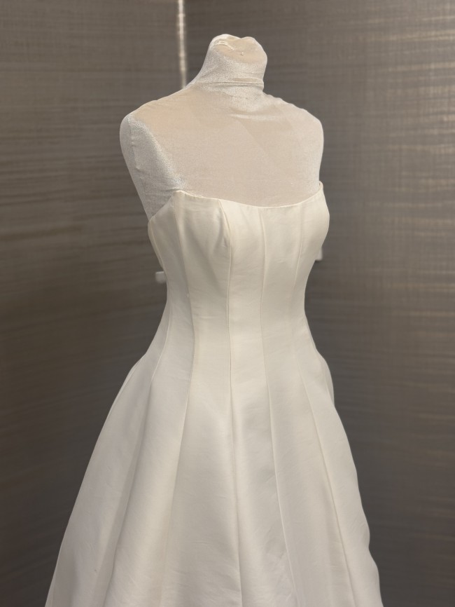 The Sophia gown is cut in Italian taffeta, featuring architectural seam details that sculpt and elongate your silhouette. Covered buttons to the hem add a classic bridal detail to this modern gown