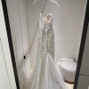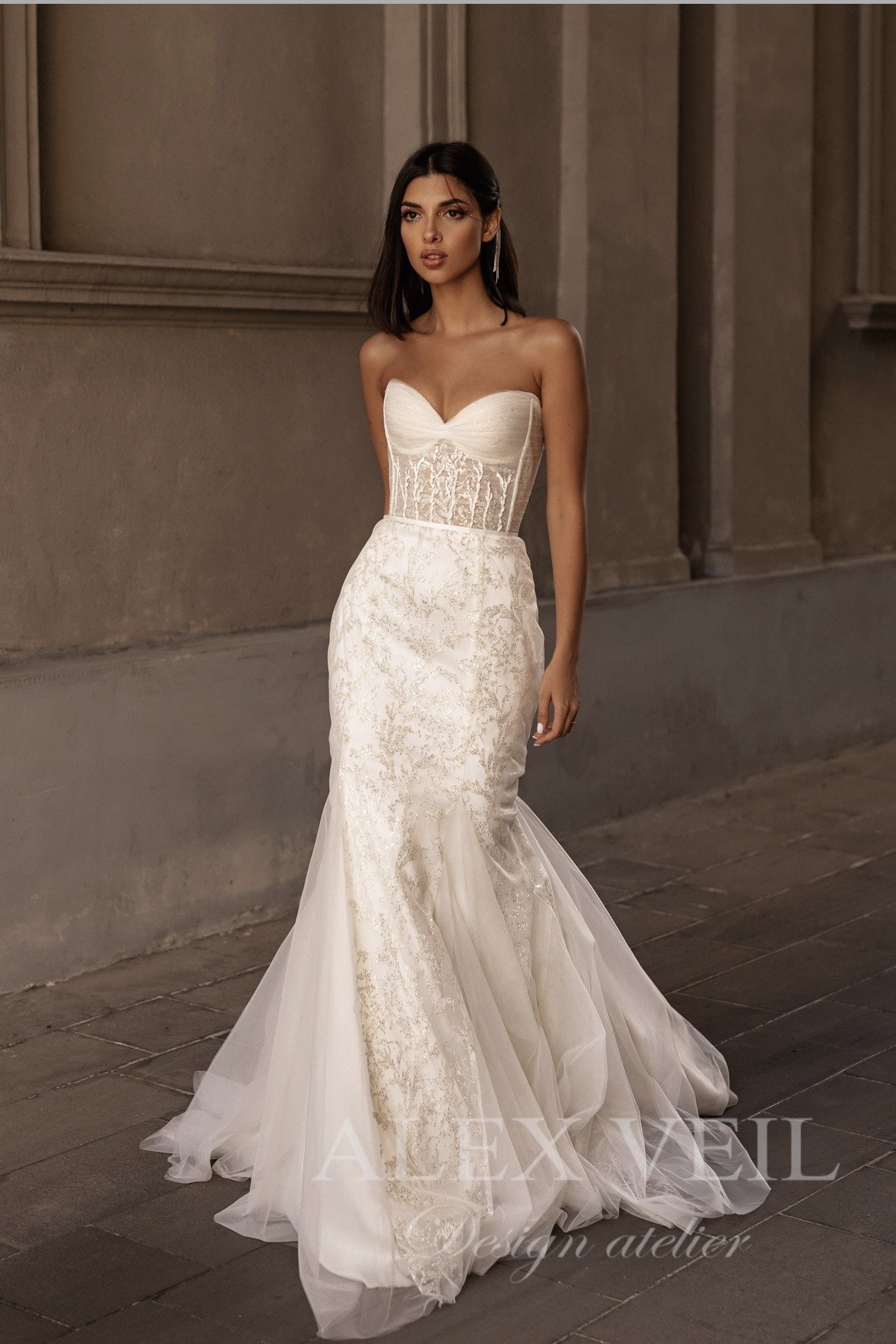 Liberta is a stylish corset wedding dress made in a beautiful mermaid silhouette. Its main fabric is tulle adorned with a sparkling pattern that adds a touch of glamour. The top features an elegant corset with cups draped in delicate tulle, and a sparkling pattern made even more eye-catching by the addition small glass marbles. This creates an intriguing ‘glow in the dark’ effect that will surely turn heads.