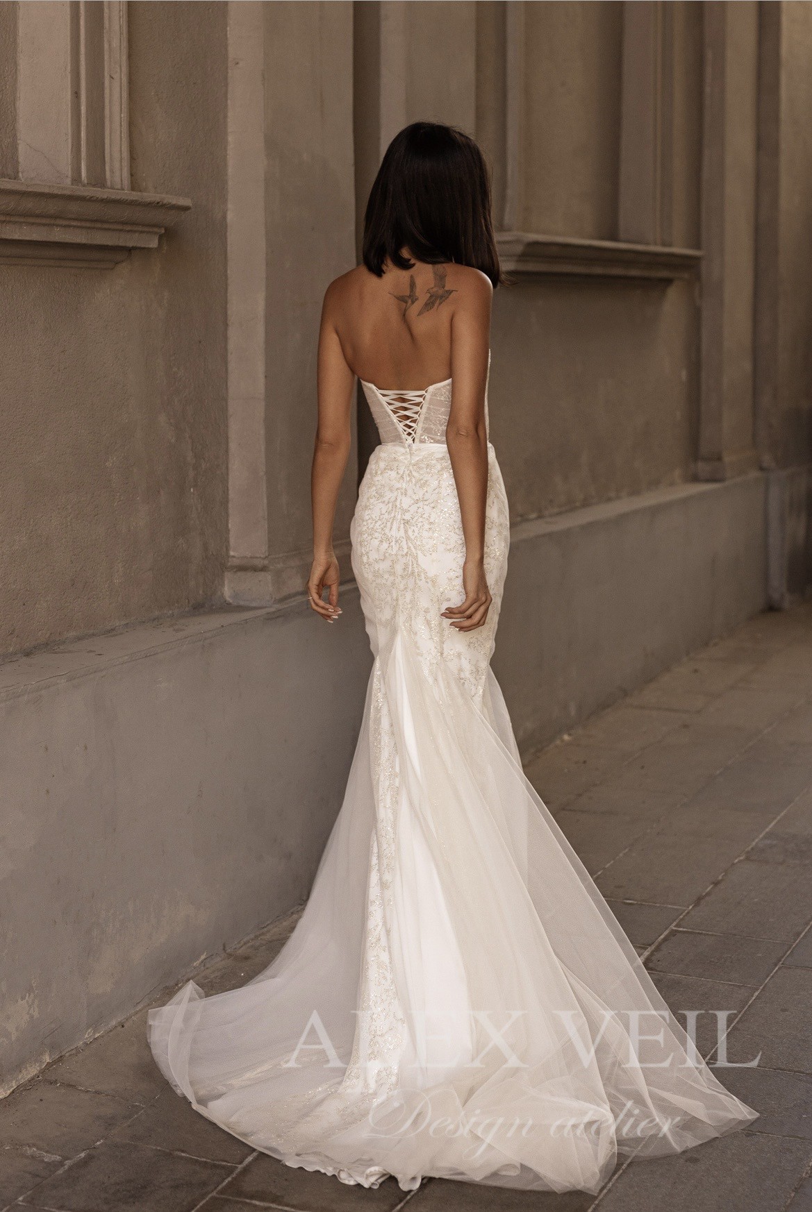 The ‘mermaid’ part of the skirt is designed with gussets made of soft bridal tulle, giving the dress an elegant flow and movement. Liberta is a splendid choice for those seeking a blend of elegance and unique charm in their wedding dress.